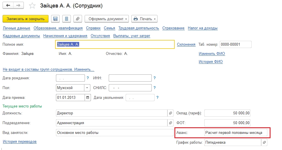 Увидеть способ начисления, назначенный конкретному сотруднику, можно непосредственно в карточке самого сотрудника (рис. 3) в реквизите «Аванс».