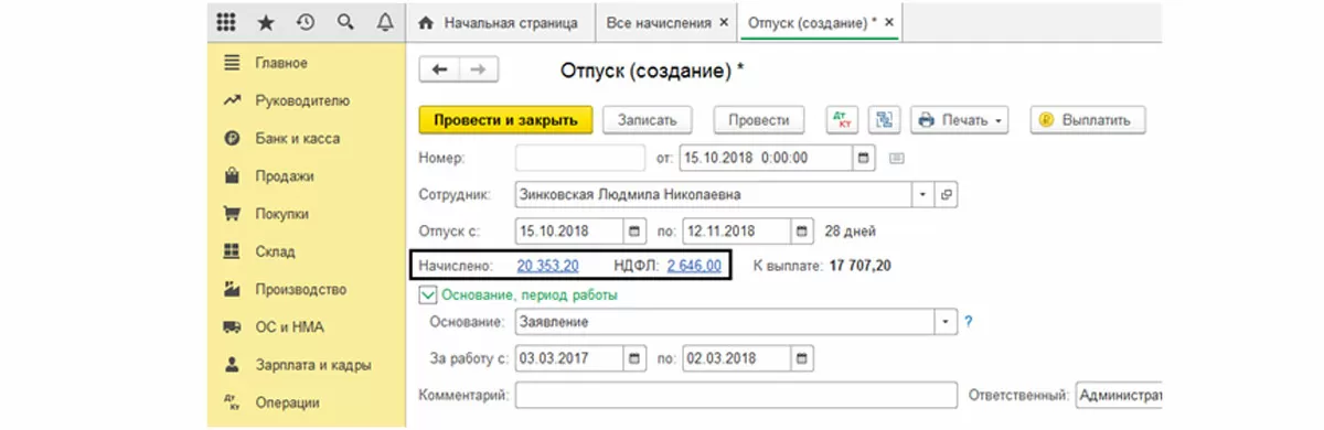 Заполняем открывшуюся форму – дату документа, выбираем сотрудника, указываем дату начала и окончания отпуска. Ниже указывается период, за который отпуск предоставляется. При этом, исходя из данных о начисленной зарплате в программе, автоматом рассчитывается сумма начисленного отпуска и НДФЛ.
