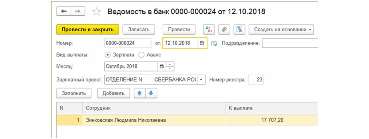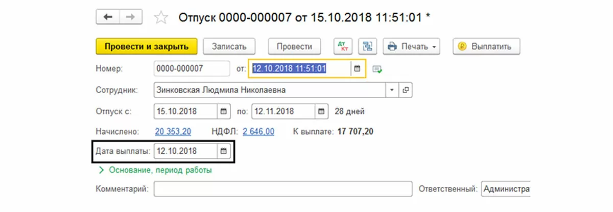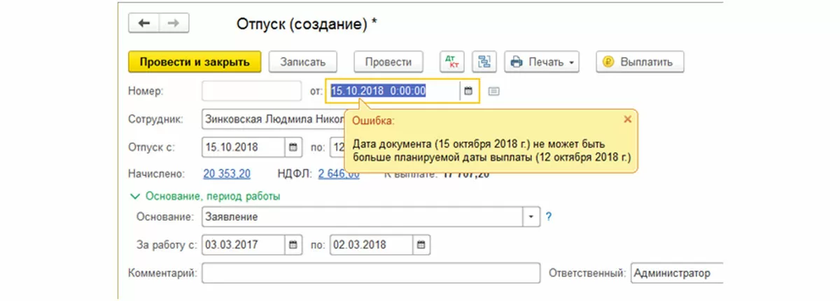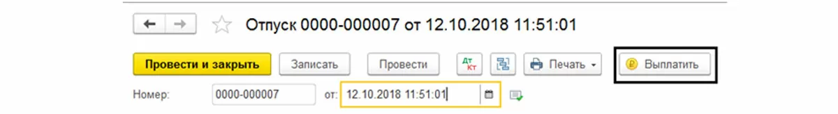 Далее проводим документ. В некоторых случаях при проведении документа может появиться ошибка – «Дата документа не может больше планируемой даты выплаты». Что делать? Ведь поля «Дата выплаты» нет в документе. В чем загвоздка?