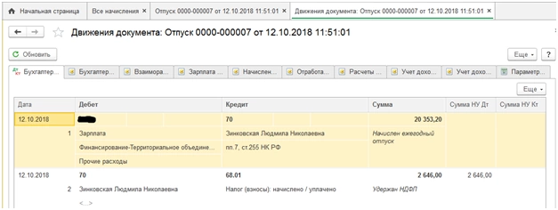 «Показать проводки и другие движения документа», мы видим, что отражены проводки по начислению отпуска и по удержанию суммы начисленного НДФЛ из него. Дебет счета начисления устанавливается в зависимости от настройки вашей организации.
