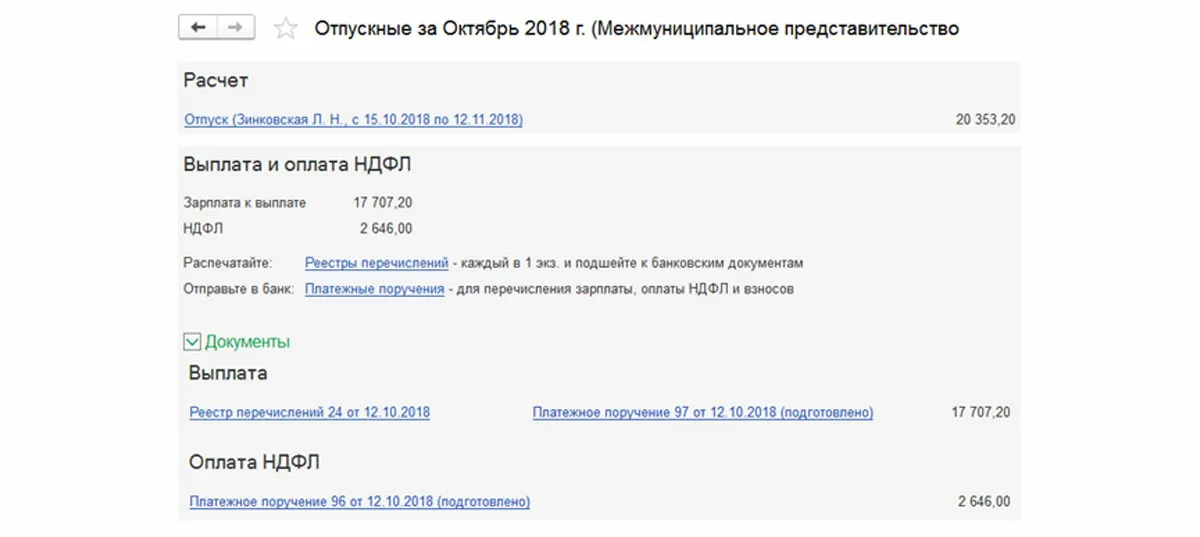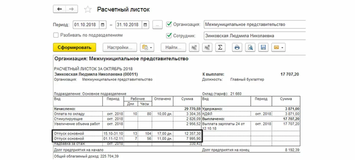 Формирование расчетного листка показывает, как отразилось начисление отпуска у сотрудника.