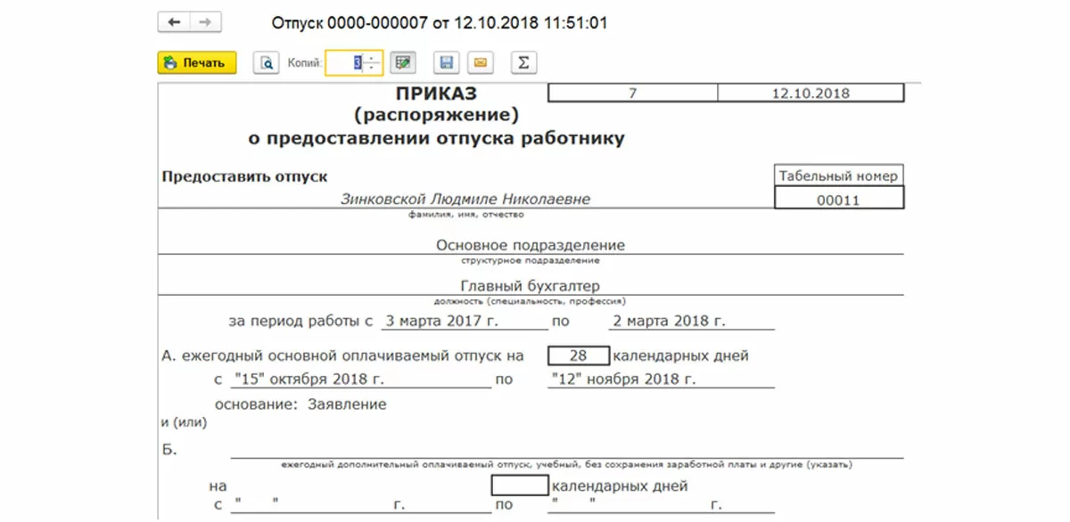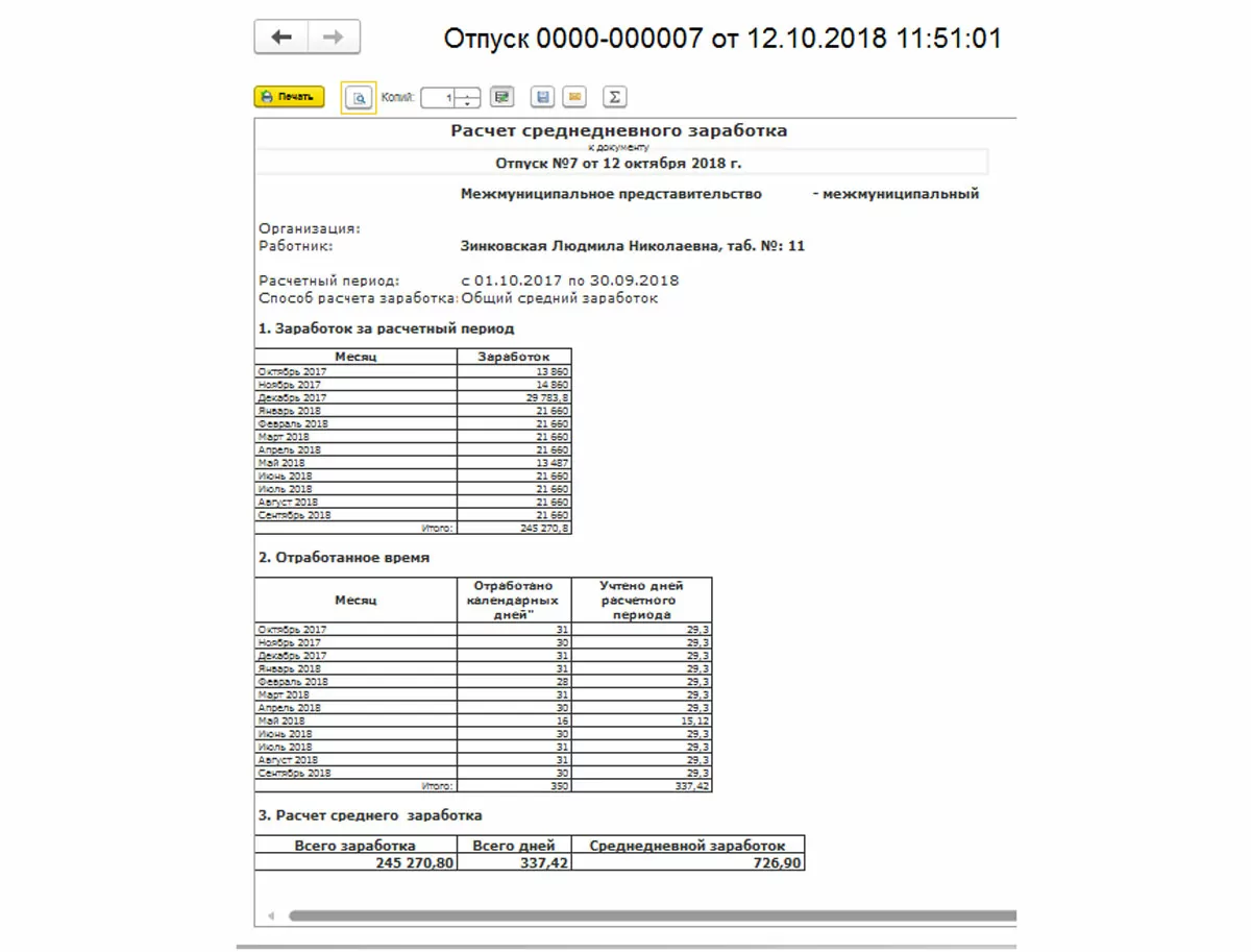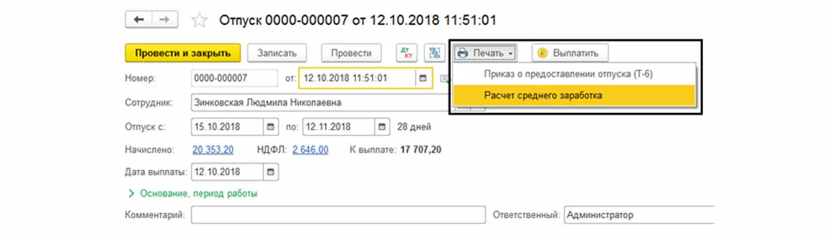 В печатных формах документа доступны «Приказ о предоставлении отпуска (Т-6)» и форма «Расчет среднего заработка» - кнопка «Печать».