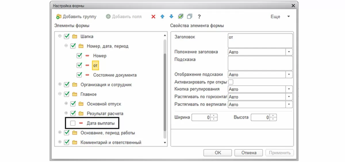 И если вам все-таки необходимо исправить дату выплаты дохода, но по умолчанию поле «Дата выплаты» скрыто, необходимо зайти в кнопку «Еще», нажать «Изменить форму», добавить галочку «Дата выплаты» в подразделе «Главное», и тогда данное поле будет доступно в форме документа при заполнении.