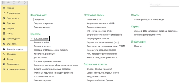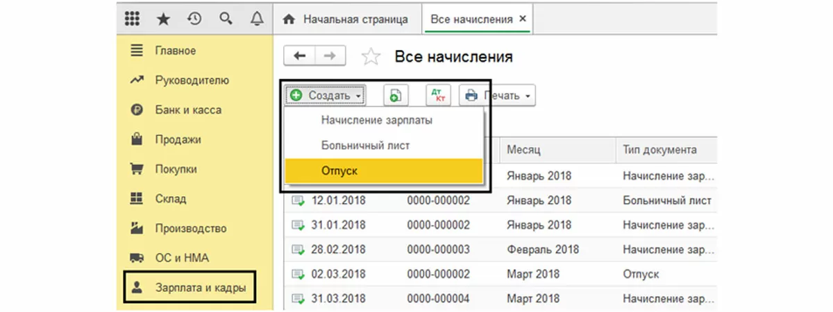 По выполнении настройки, в журнале начислений будет доступен документ «Отпуск-Зарплата и кадры-Зарплата».