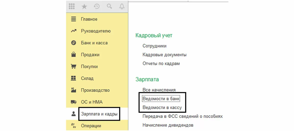 Нажав кнопку «Выплатить» из документа, программа подготовит документы по выплате отпускных – «Ведомость в банк» или «Ведомость в кассу», документы «Платежное поручение» на выплату отпускных и уплату налогов. Если Вам все эти документы формировать не надо, то выплату отпускных можно оформить самим в журналах «Ведомости в банк» или «Ведомости в кассу» - пункт меню «Зарплата и кадры».