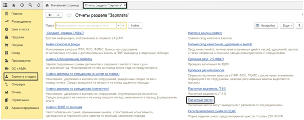 Заходим в пункт меню «Зарплата и кадры-Отчеты по зарплате-Расчетный листок».