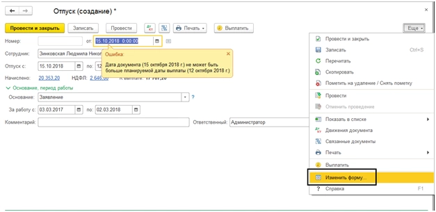 Правильнее – изменить дату проведения документа (начисления отпуска), т.к. оплата отпуска должна производиться работодателем не позднее, чем за три дня до его начала. Это положение закреплено в Трудовом кодексе, где срок выплаты отпускных прописан в статье 136, части 9. Когда дата выплаты приходится на нерабочий или праздничный день, перечисление или выдача средств сотруднику должны быть произведены накануне. Таким образом, выплата отпускных должна быть произведена до его начала.