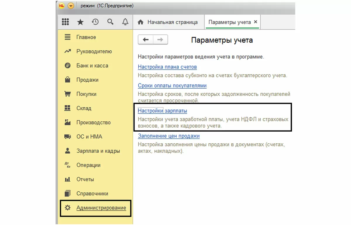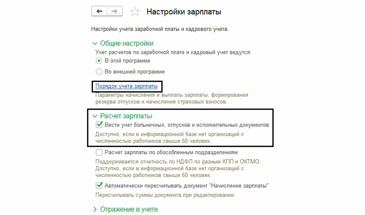 Эта настройка доступна для небольших фирм, если в базе ведется учет до 60 сотрудников – то по гиперссылке «Порядок учета зарплаты», а при необходимости выполнить настройку формирования резерва отпусков – закладка «Резервы отпусков».
