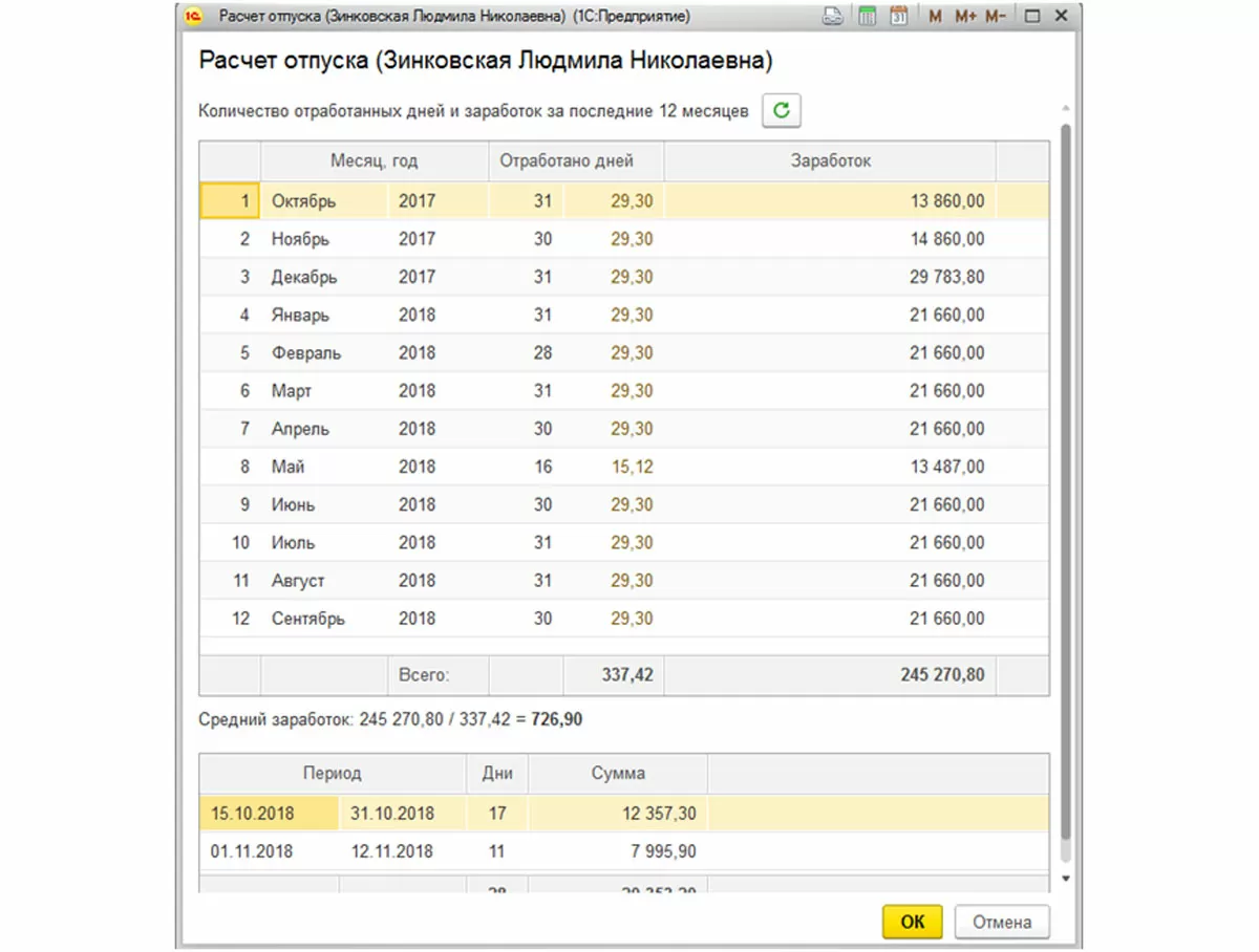 Ниже в таблице показаны начисления, исходя из установленных дней отпуска. При этом видно, что часть отпуска приходится на октябрь месяц, остальные дни – ноябрь. Соответственно, в программе сумма отпускных разбита на две части – с 15.10.18 по 31.10.18 и 01.11.18 по 12.11.18.