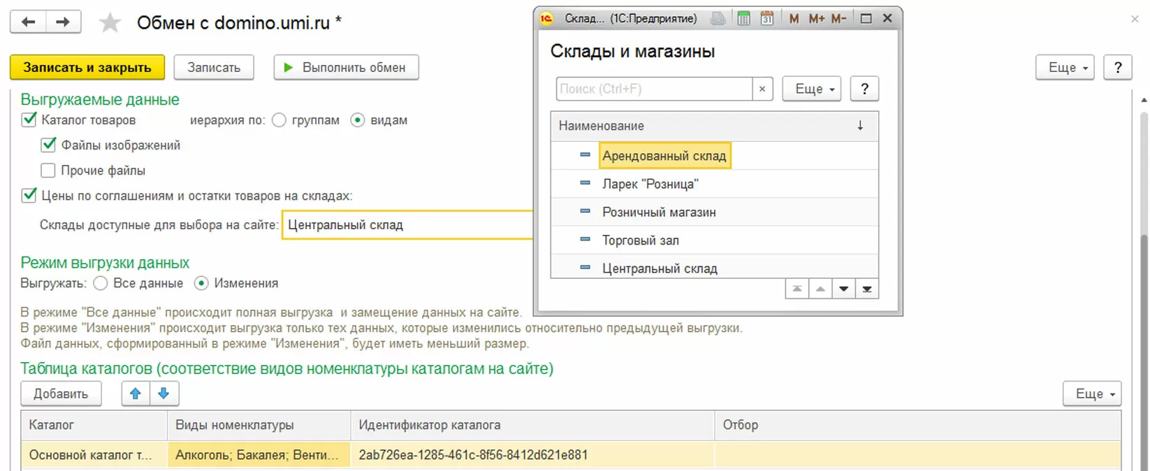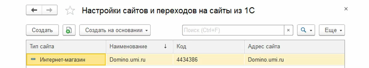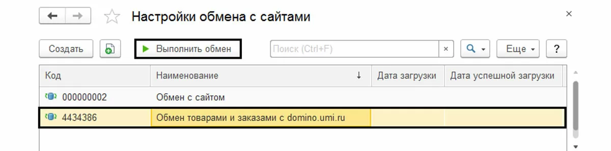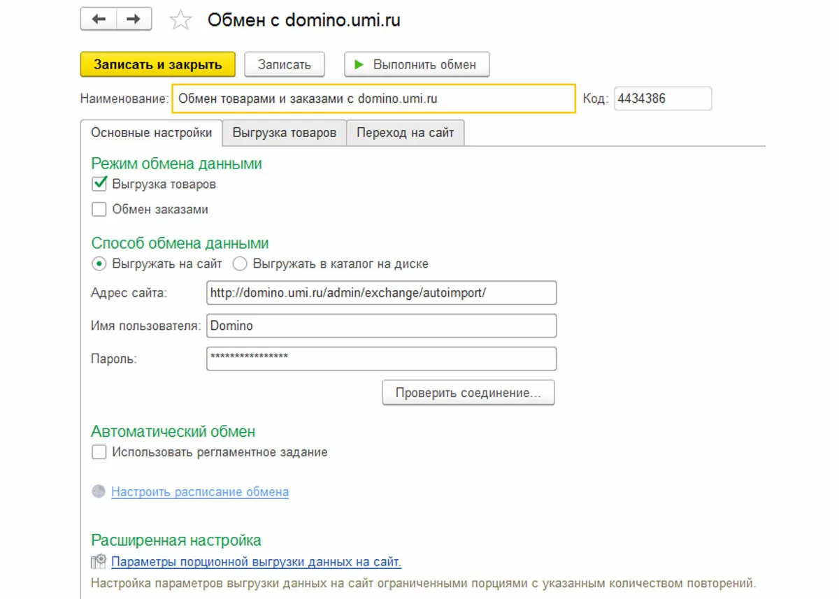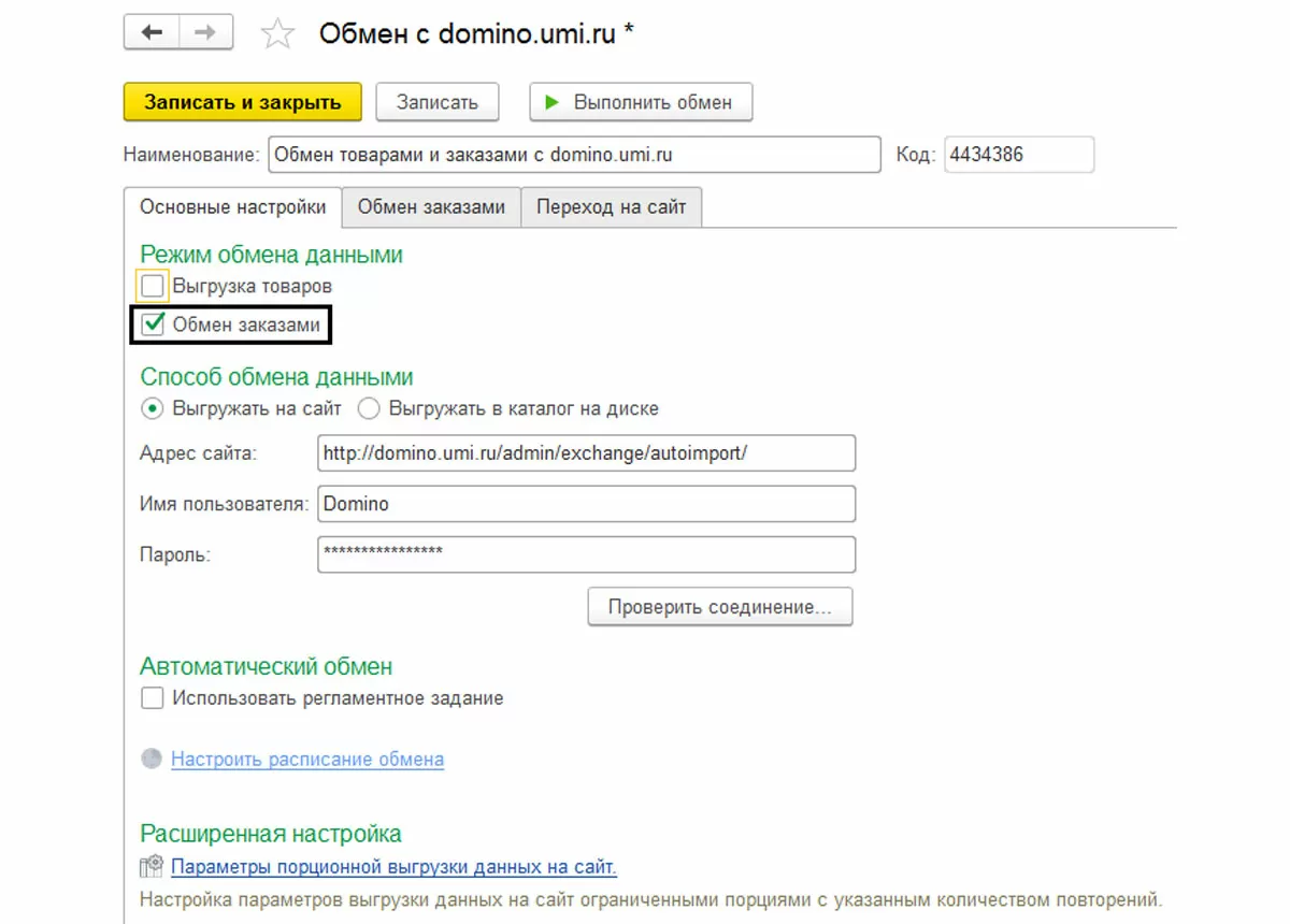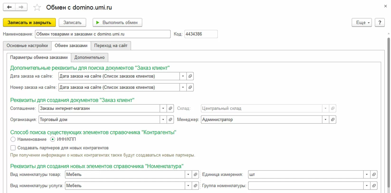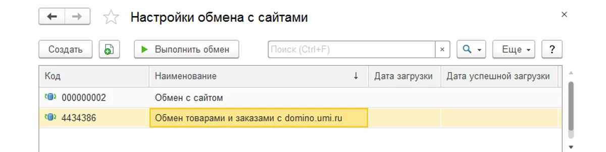 Настройка «Обмен товарами и заказами с domino.umi.ru» создана автоматически. Первая настройка – «Обмен с сайтом», предназначена для самостоятельной настройки, если у вас уже имеется сайт, и осуществляется аналогично нашей.