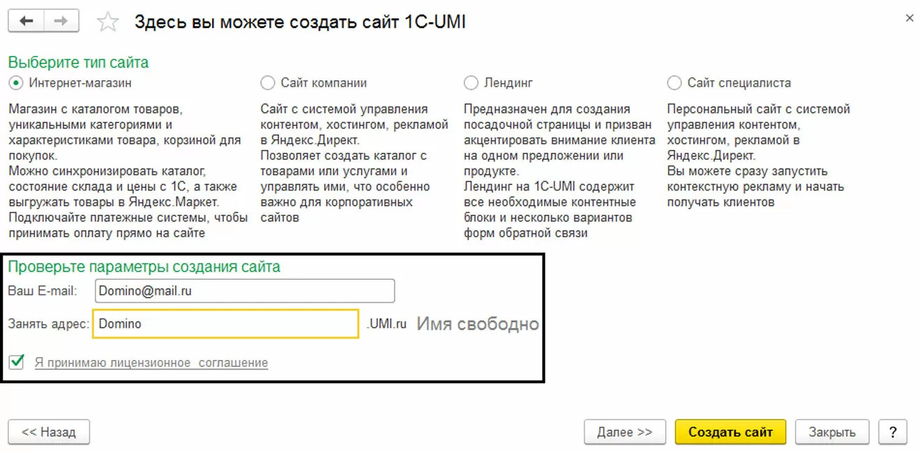 Для создания сайта нам достаточно выбрать тип сайта (в нашем случае это интернет-магазин) и ввести свои данные – желаемый адрес и электронная почта, куда будут приходить уведомления и заказы покупателей. При вводе адреса система автоматически проверяет занято имя или свободно. Устанавливаем галочку «Я принимаю лицензионное соглашение» и нажимаем кнопку «Создать сайт».