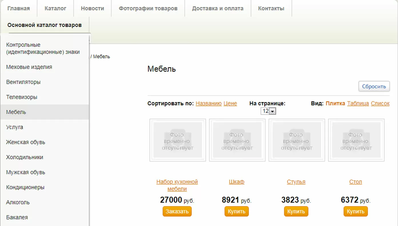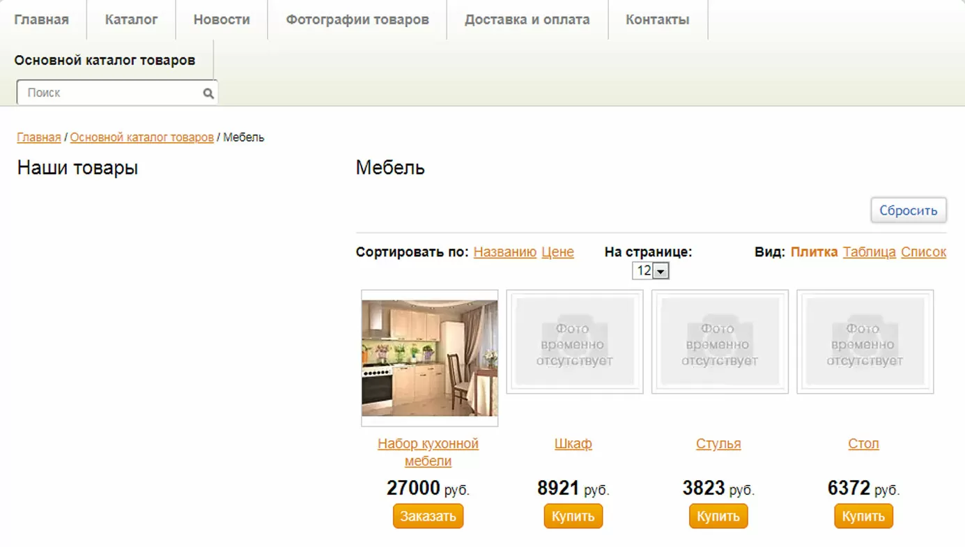 После окончания выгрузки проверим изменения на нашем сайте. В меню «Каталог» отобразились наши группы номенклатуры из программы, а в них и сама номенклатура – названия, цены.
