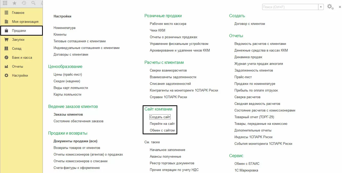 В пункте меню «Обмен с сайтом» (раздел меню «Продажи» - «Сайт компании») находятся настройки обмена с сайтом.