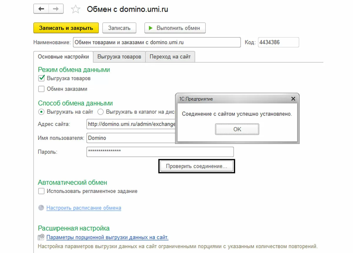 В настройке прописан адрес сайта и данные для доступа. Нажав кнопку «Проверить соединение...», проверяем связь с сайтом.