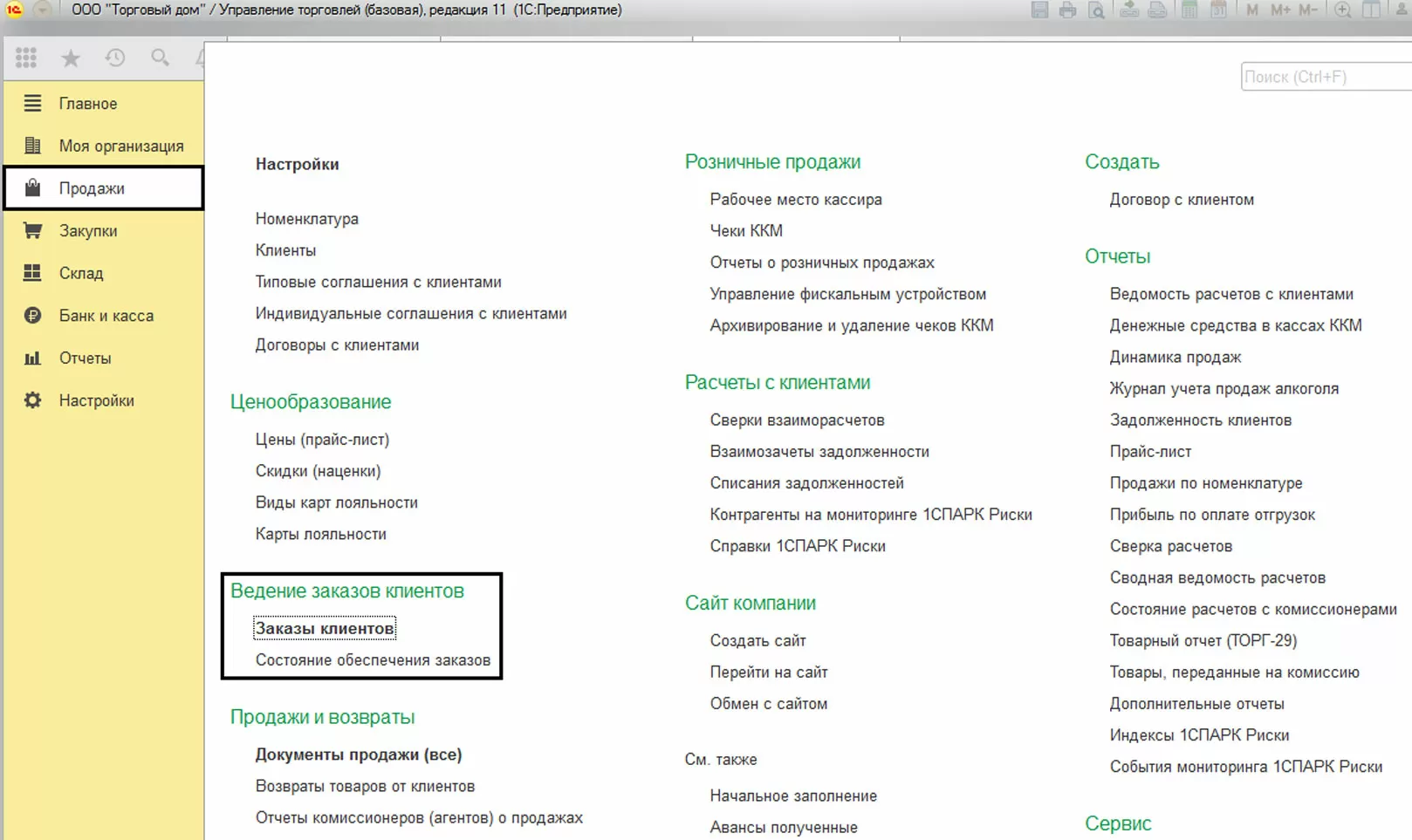 Нажимаем кнопку «Выполнить обмен» и проверяем заказы в программе 1С. Перейдем в раздел меню «Продажи» - «Ведение заказов клиентов».