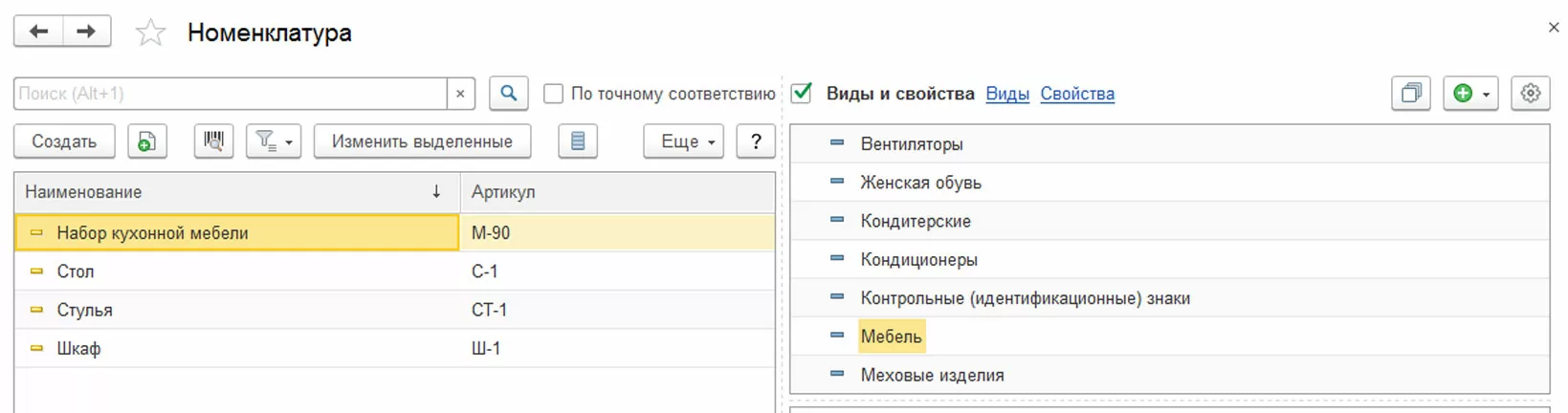 Конечно же, этих данных недостаточно, но мы видим, что наша настройка работает. Далее в настройках номенклатуры добавим дополнительную информацию о товарах, их описание, фотографии. Для этого перейдем в справочник «Номенклатура» (пункт меню «Продажи»).