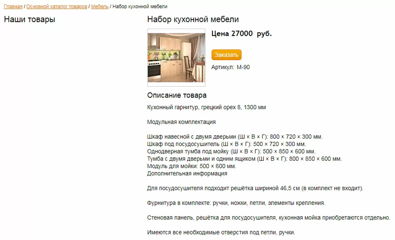 Переходим на сайт и проверяем информацию. В каталоге появилась наша первая номенклатура с картинкой и описанием. Открыв ее, внутри мы видим подробное описание товара, выгруженное на сайт из программы 1С.