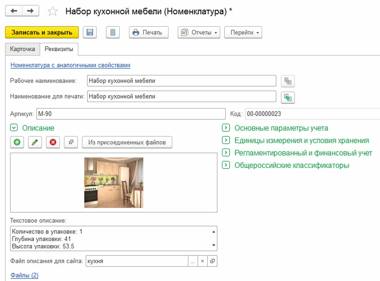 В карточке номенклатуры, на закладке «Реквизиты», можно добавить текстовое описание к номенклатуре и файлы фотографий для описания. В строке «Файл описания для сайта» добавляем файлы, которые в дальнейшем будут добавлены в раздел «Описание», с помощью кнопки «Из присоединенных файлов».