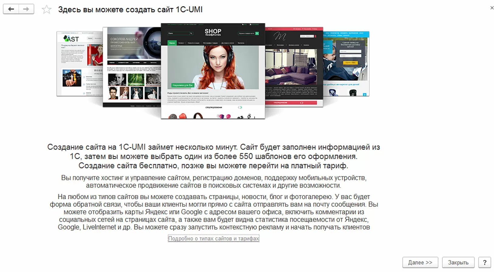 Перейдя в раздел меню «Создать сайт», с помощью помощника создаем торговую площадку. Сайт создается на платформе 1С-UMI. Создание сайта бесплатное, при использовании расширенных возможностей можно перейти на платный тариф.