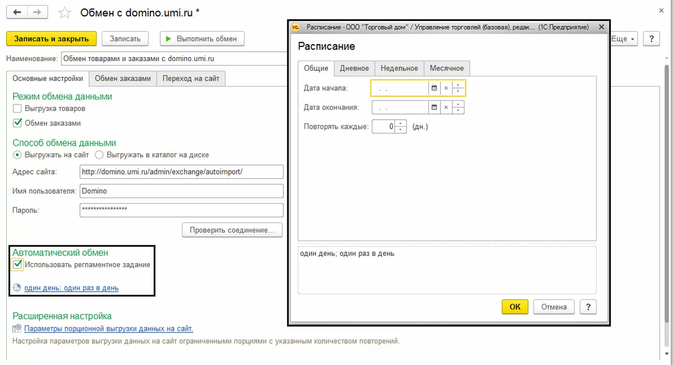 Для автоматического обмена данными с сайтом можно настроить расписание обмена с сайтом. Для этого необходимо установить галочку «Использовать регламентное задание» и настроить расписание обмена.