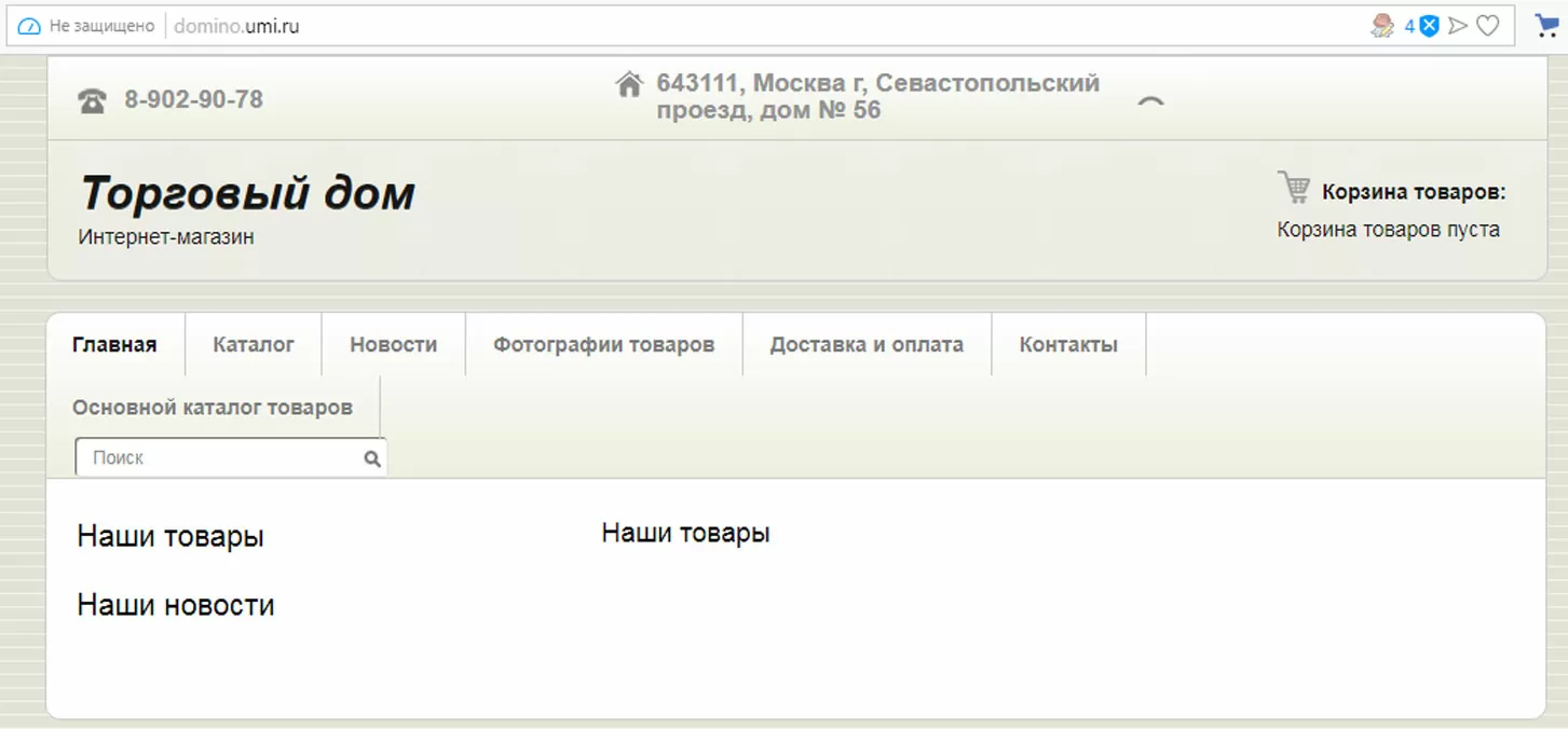 После завершения создания сайта он автоматически откроется в браузере. Адрес сайта, который мы указали, – domino, с добавлением UMI. Это условие бесплатного пользования. При переходе на платный тариф у компании будет свой домен. Сайт создан по шаблону, внешний вид которого в дальнейшем можно изменить. Мы видим место для наших товаров – «Каталог».
