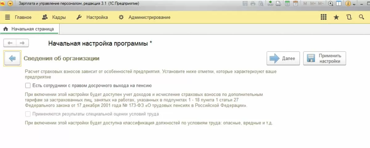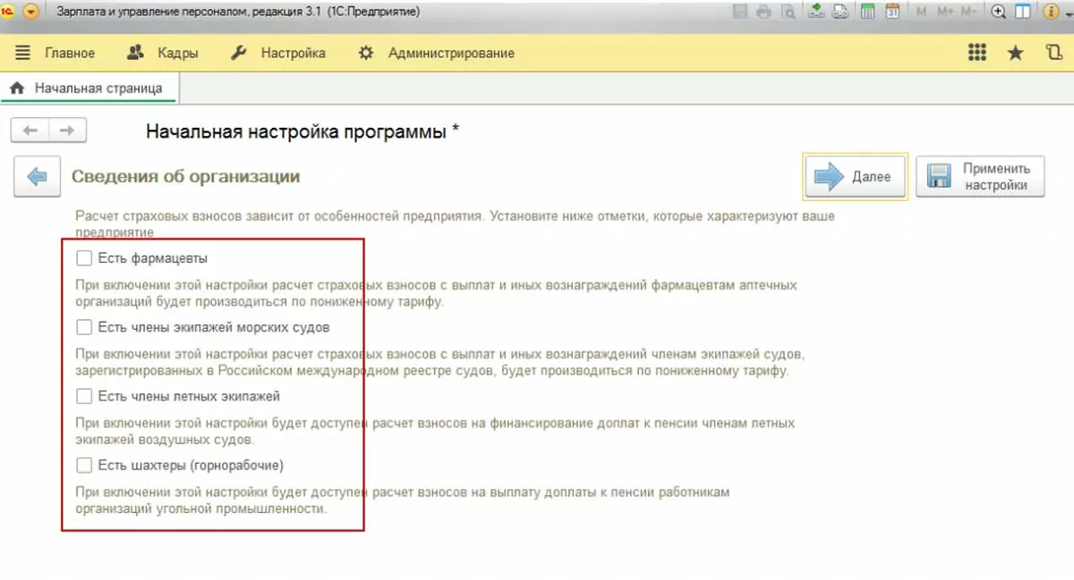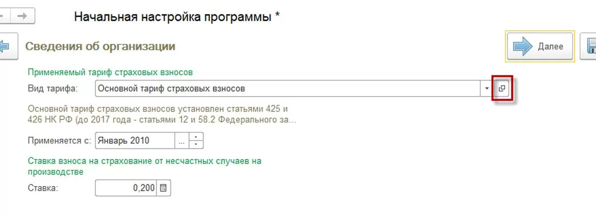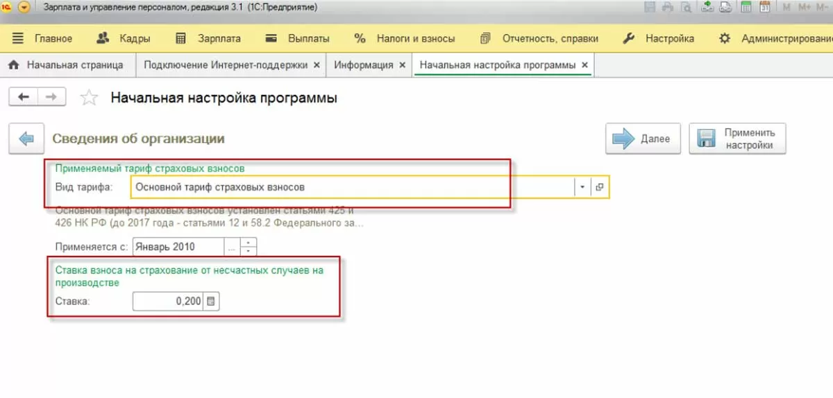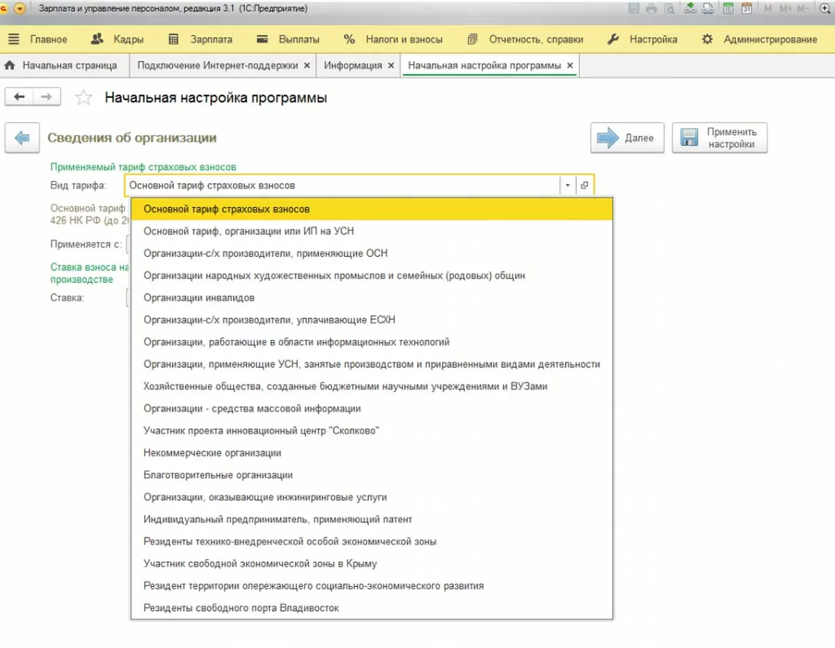 При начальном запуске программы 1С:Зарплата и Управление персоналом 3.1 в обработке «Начальная настройка программы» после того, как мы заполнили наименование нашей фирмы и ИНН, мы можем выбрать, по какому тарифу будут уплачиваться страховые взносы.