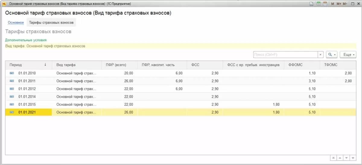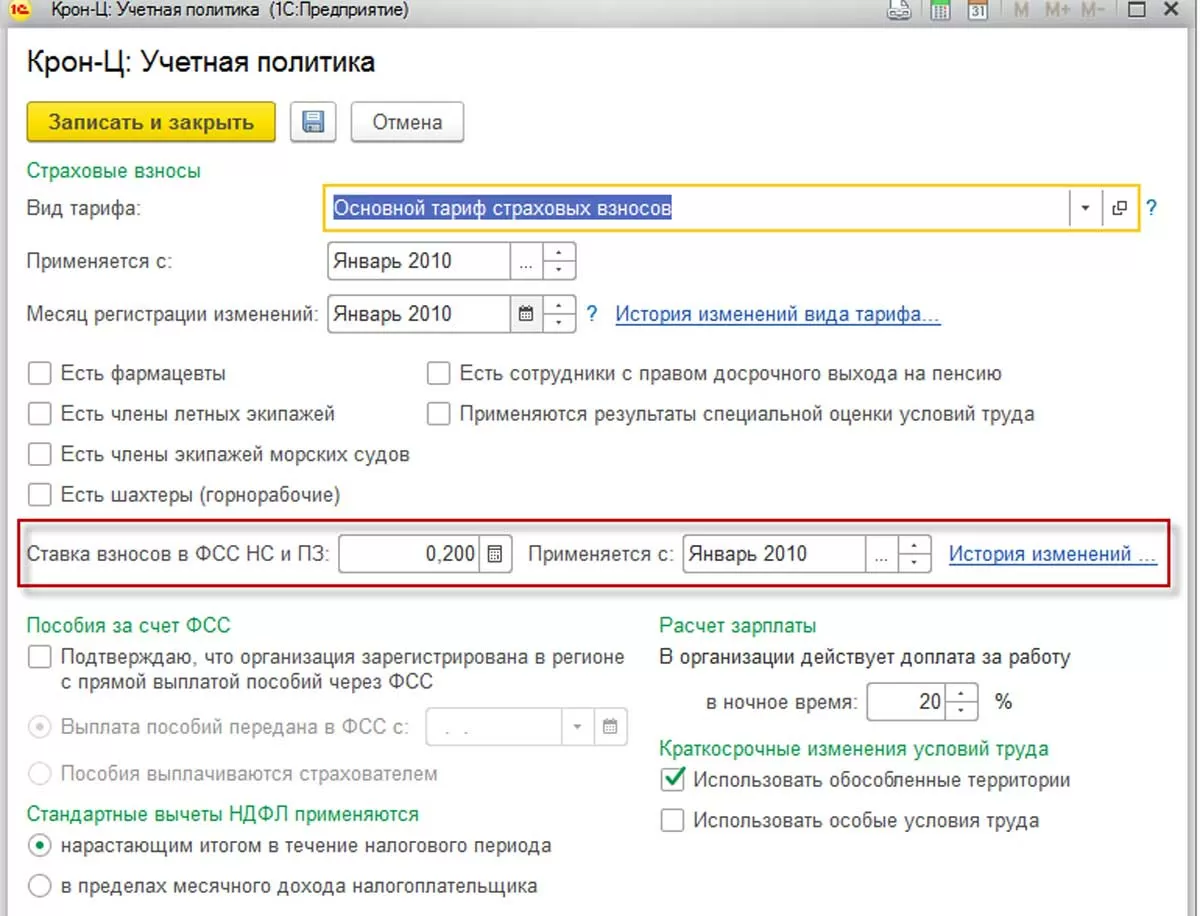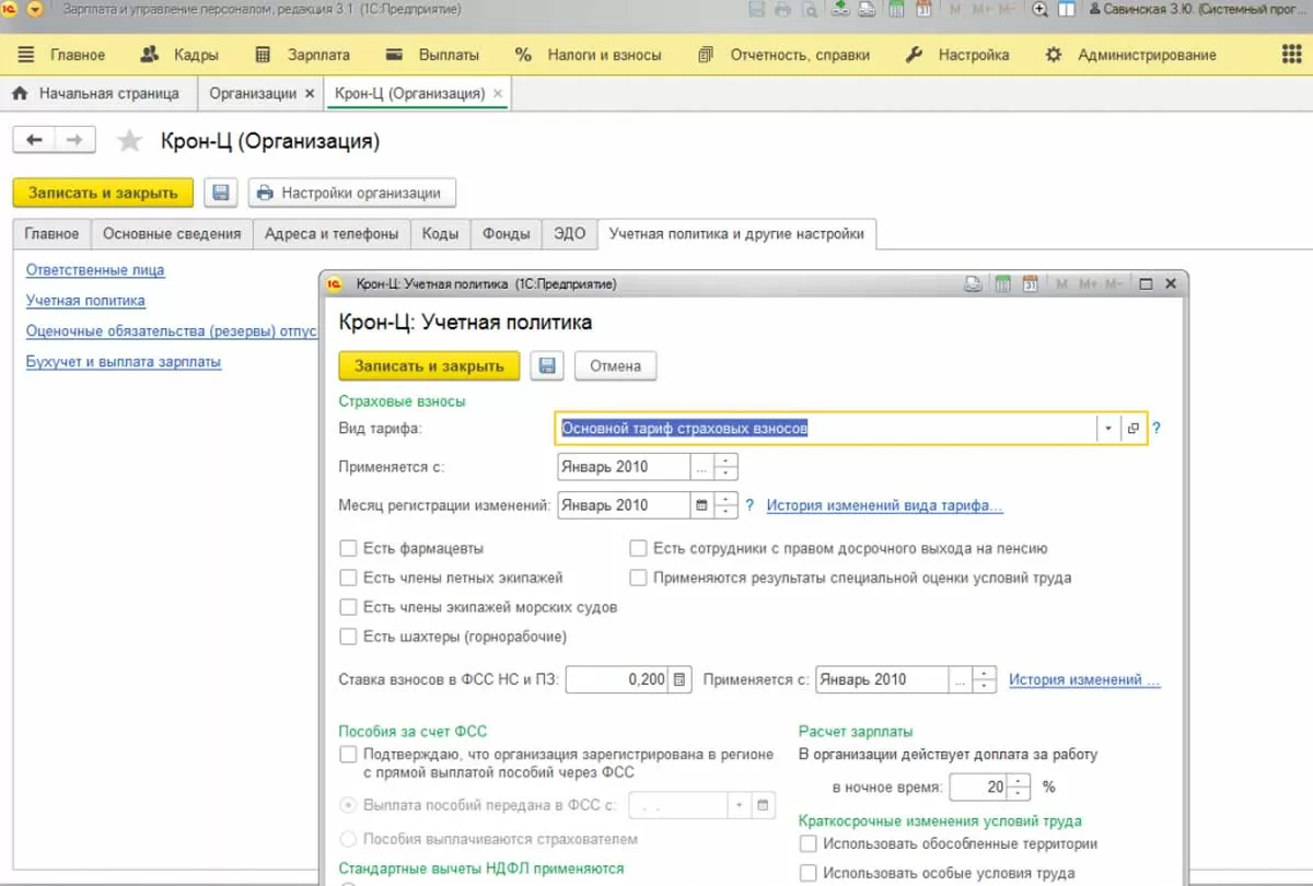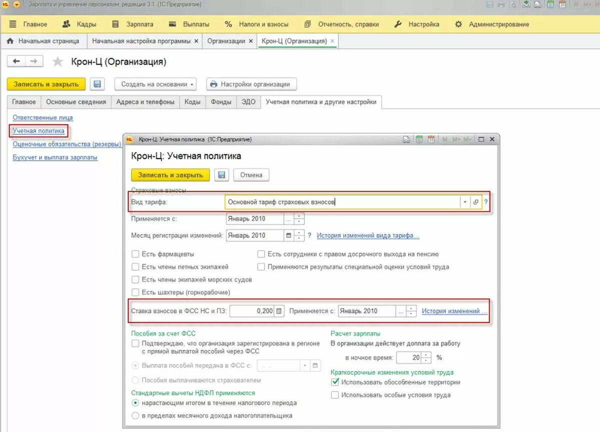 Тарифы страховых взносов могут настраиваться при первом открытии программы, в реквизитах организации (в учетной политике) – это общие тарифы. Кроме того – отклонения от общих тарифов настраиваются в конкретных начислениях, когда какие-то виды выплат не облагаются взносами на социальное страхование или облагаются частично