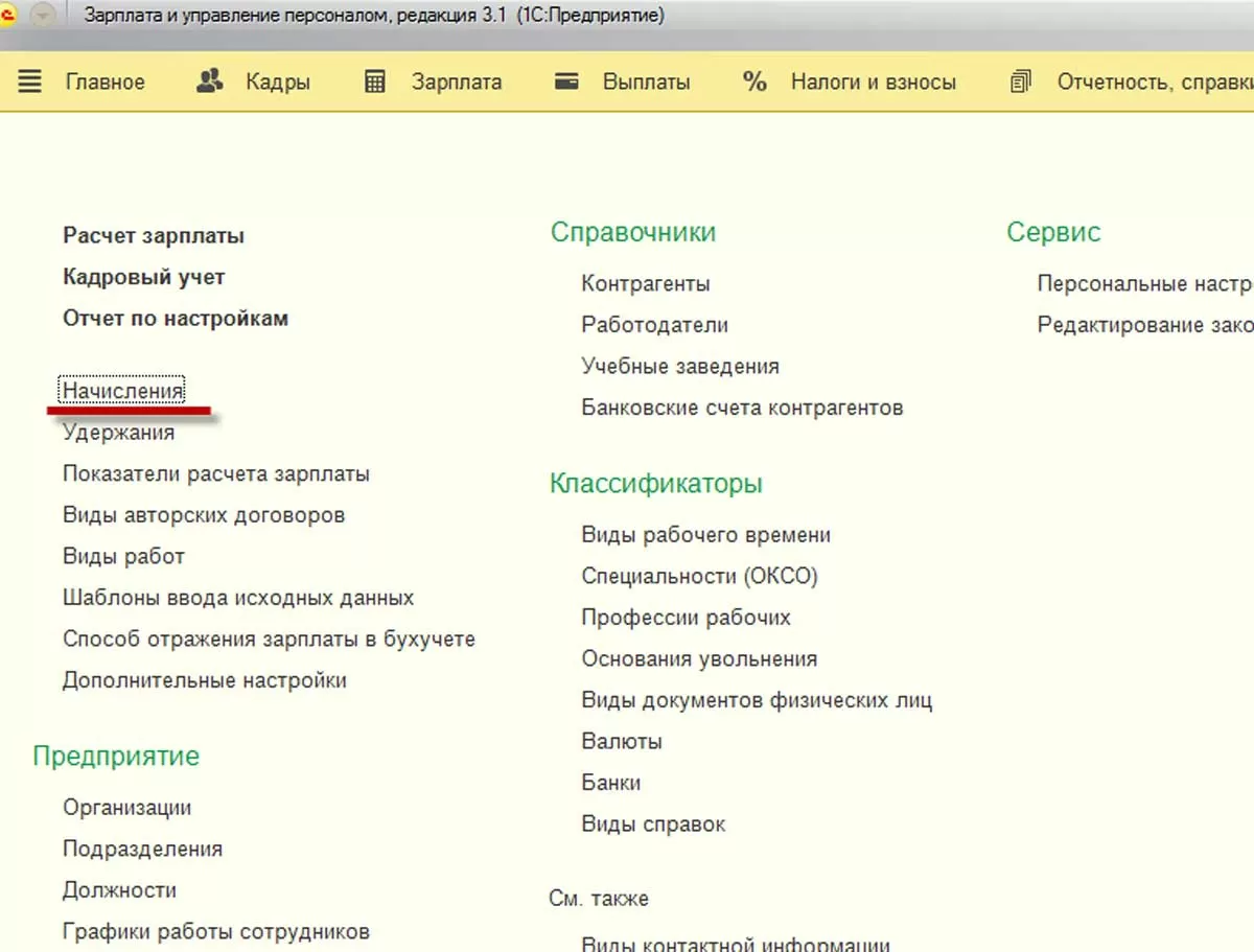 Меню «Настройка» - «Начисления», открываем интересующее нас начисление и переходим на закладку «Налоги, взносы, бухучет».