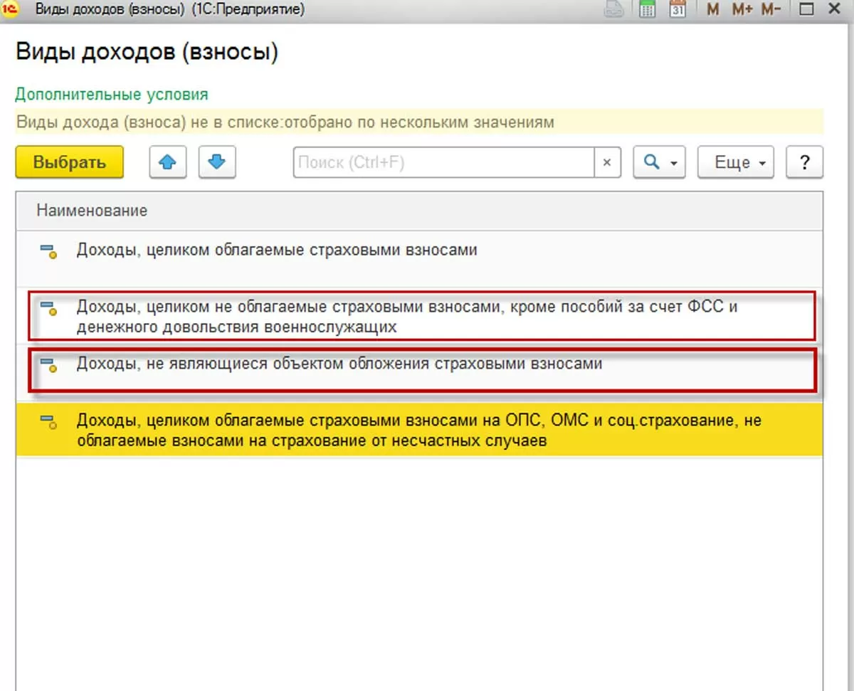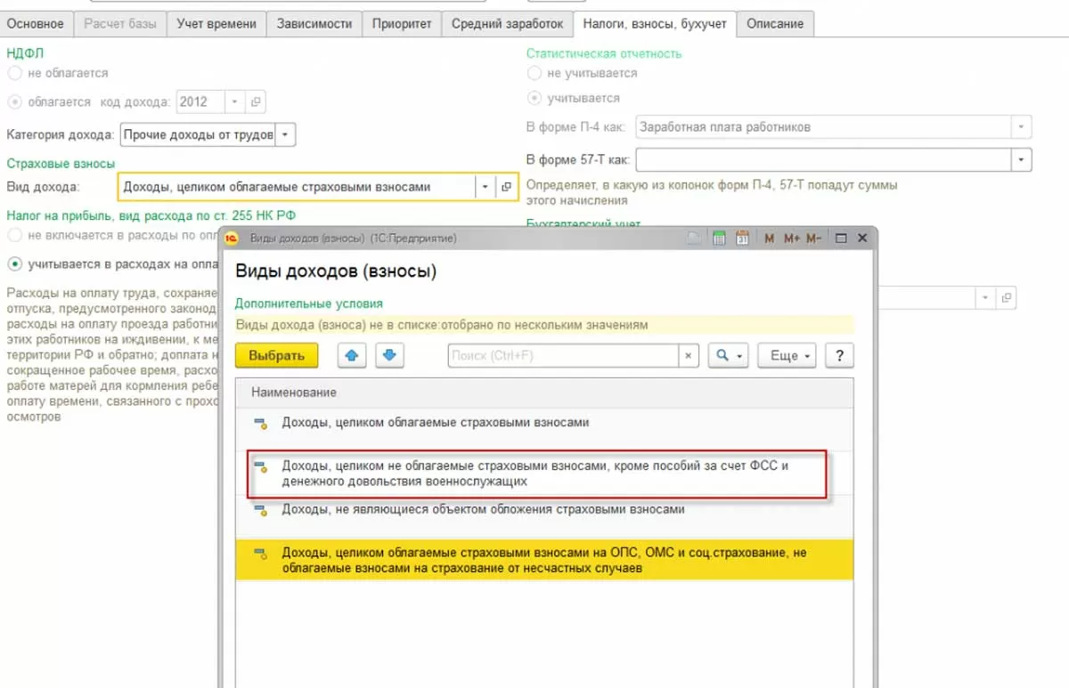 В заключение отметим, чем отличаются варианты «Доходы, не являющиеся объектом обложения страховыми взносами» и «Доходы, целиком не облагаемые страховыми взносами, кроме пособий за счет ФСС и денежного довольствия военнослужащих».