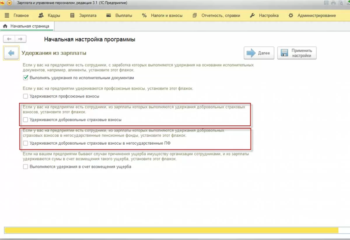 Если в нашей организации есть сотрудники, уплачивающие добровольные страховые взносы в пенсионный фонд или в негосударственные пенсионные фонды, ставим «флажки» согласно Рис.8.