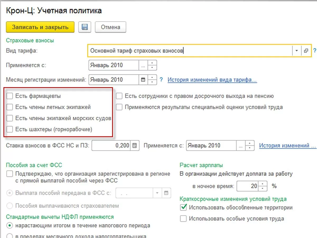 Например, ранее для фармацевтических организаций на специальных налоговых режимах применялась льгота по страховым взносам. Для применения льготы при расчете страховых взносов нужно было в настройках налогов и отчетов указать тариф и признак «Есть фармацевты», а далее повторить этот же признак в карточках выбранных должностей. Данное включение настройки по наличию фармацевтических должностей не имеет истории изменения, но многие организации оставили этот признак, а это неправильно. При отмене данной льготы следует убрать признак.