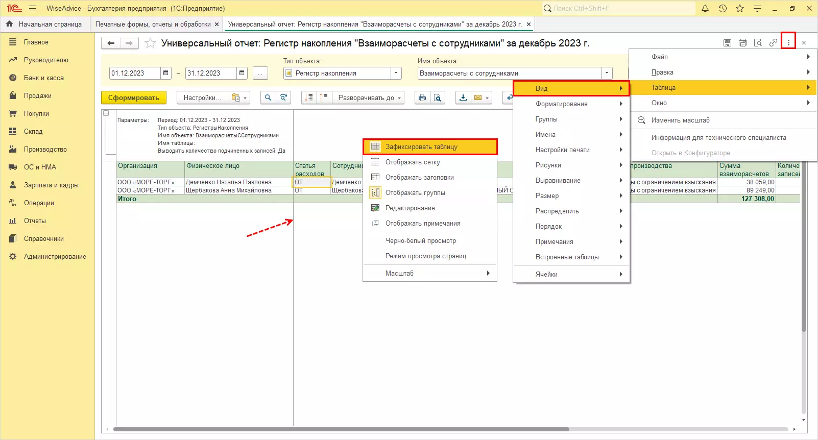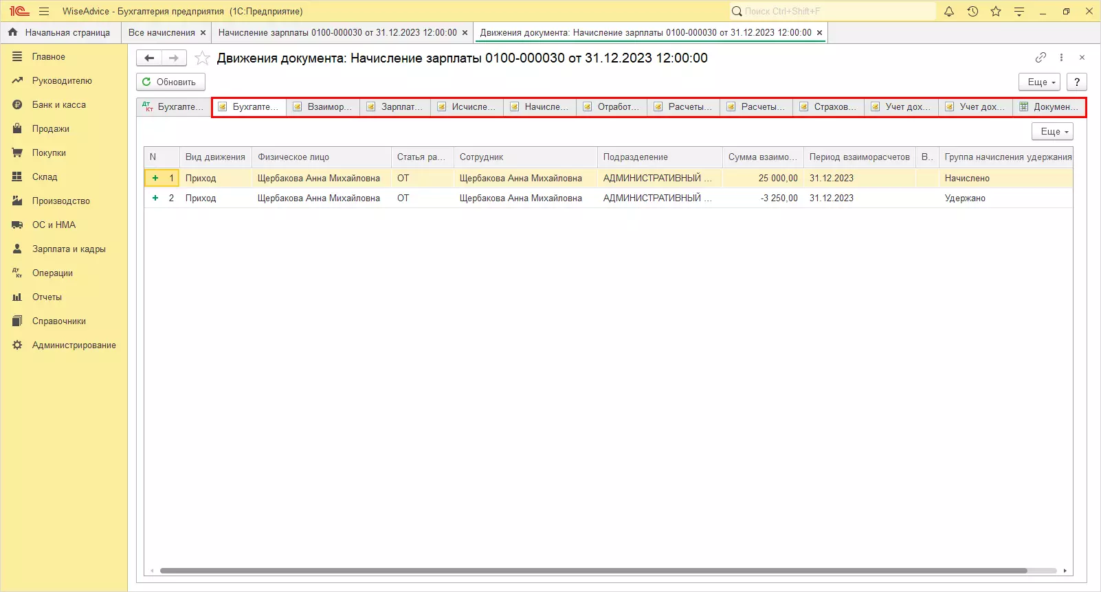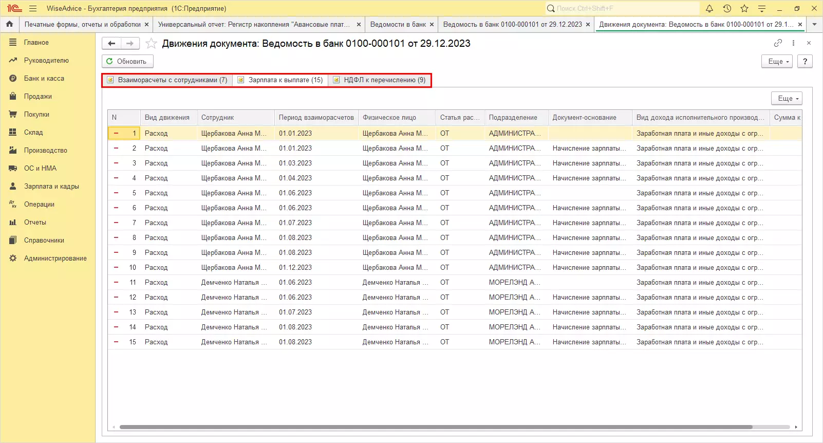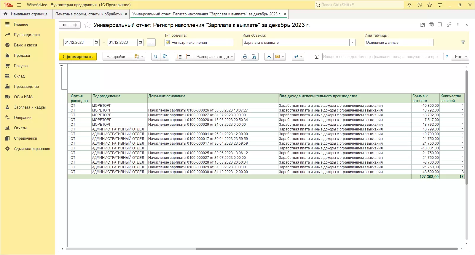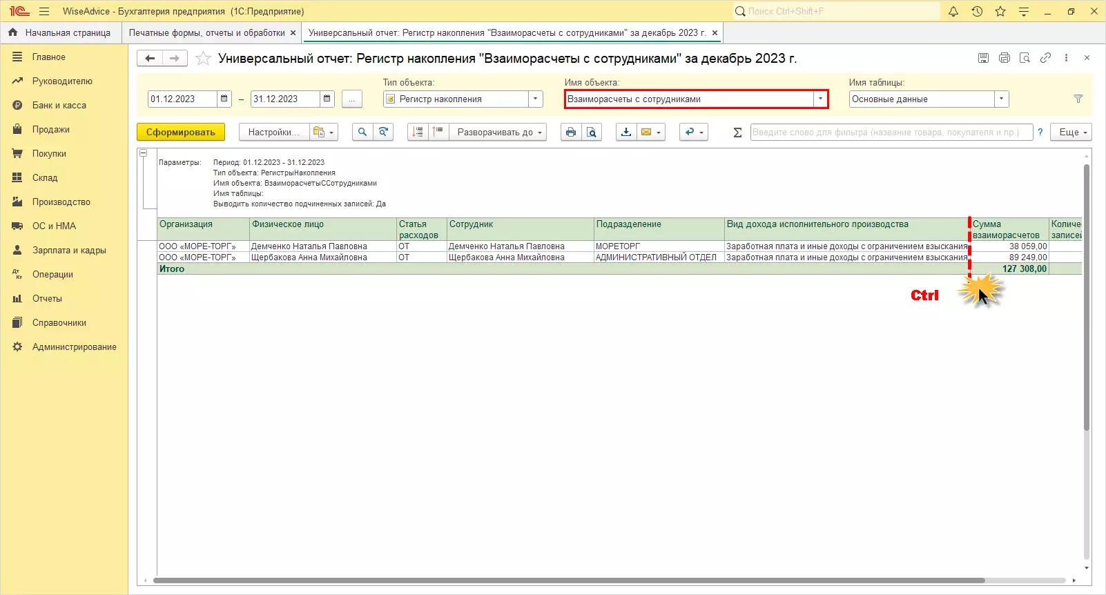 Аналогично формируется отчет по регистру Взаиморасчеты с сотрудниками. Оба отчета показывают информацию о том, как складывается зарплата к выплате и сколько мы должны сотруднику. Далее можно посмотреть детализацию, расшифровки записей и т.п.