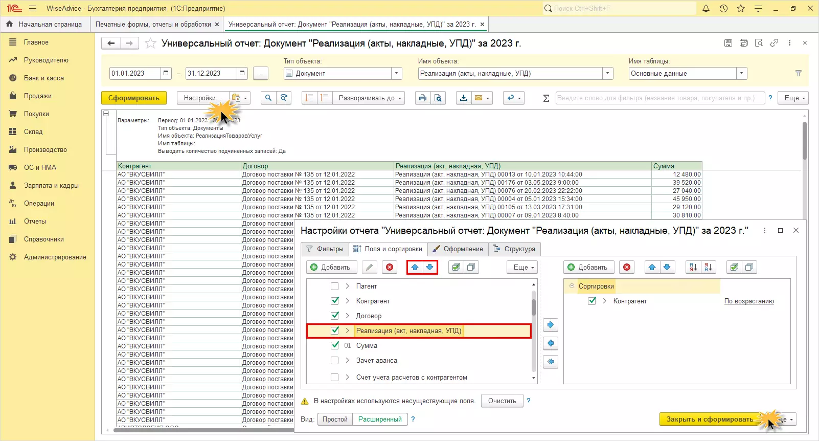 Шаг 5. Отметьте в настройках дополнительное поле «Реализация (акт, накладная УПД)», передвинув его в нужную позицию с помощью стрелочек Вверх – Вниз. В результате, в отчете появилась еще одна графа.