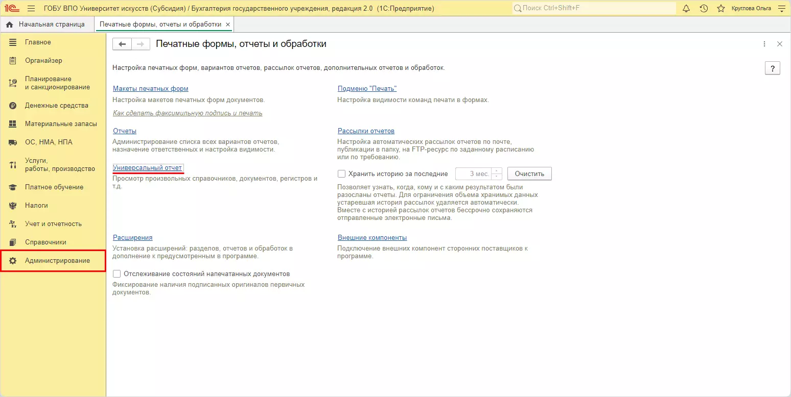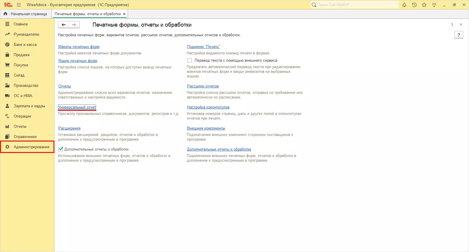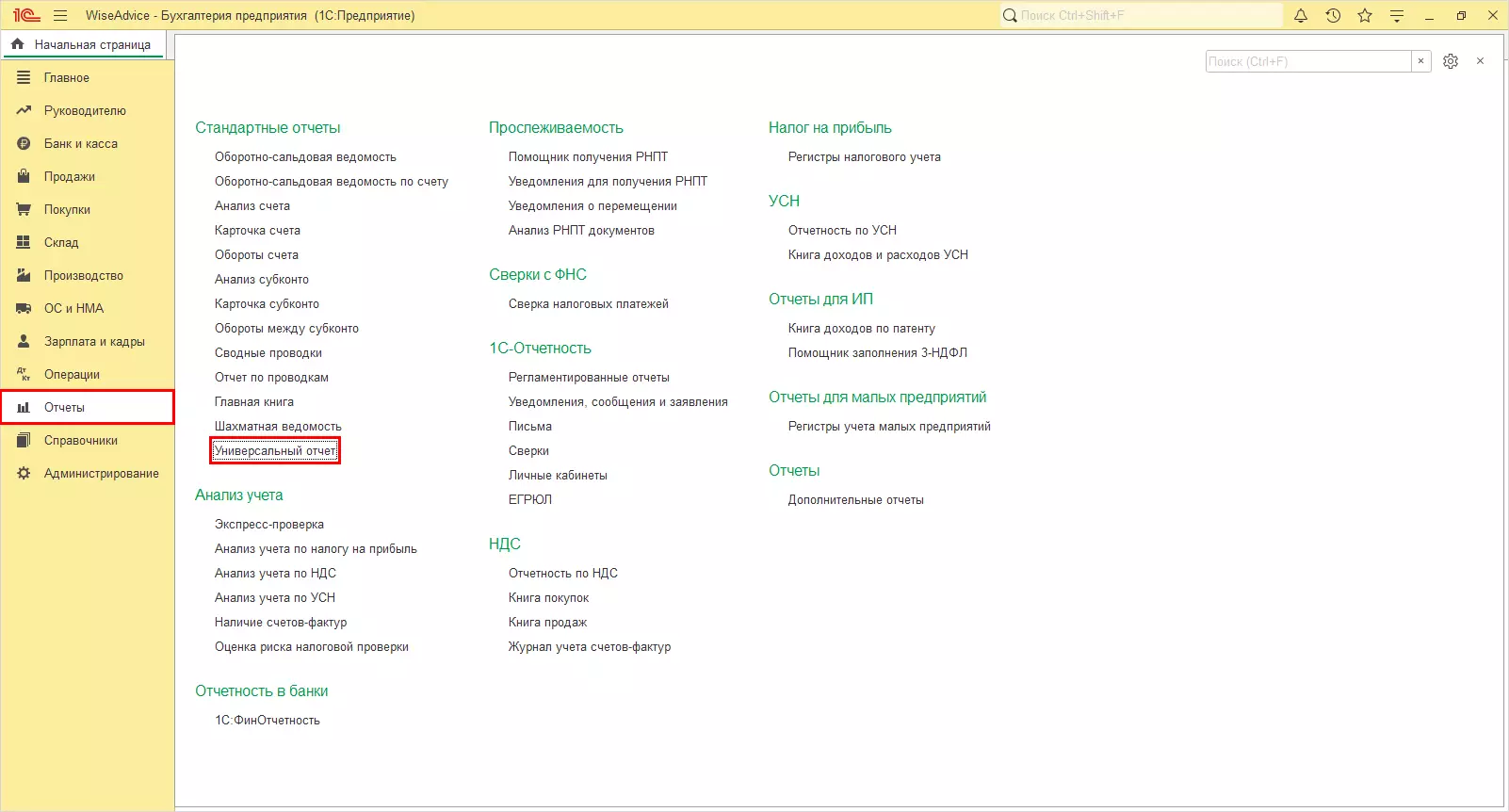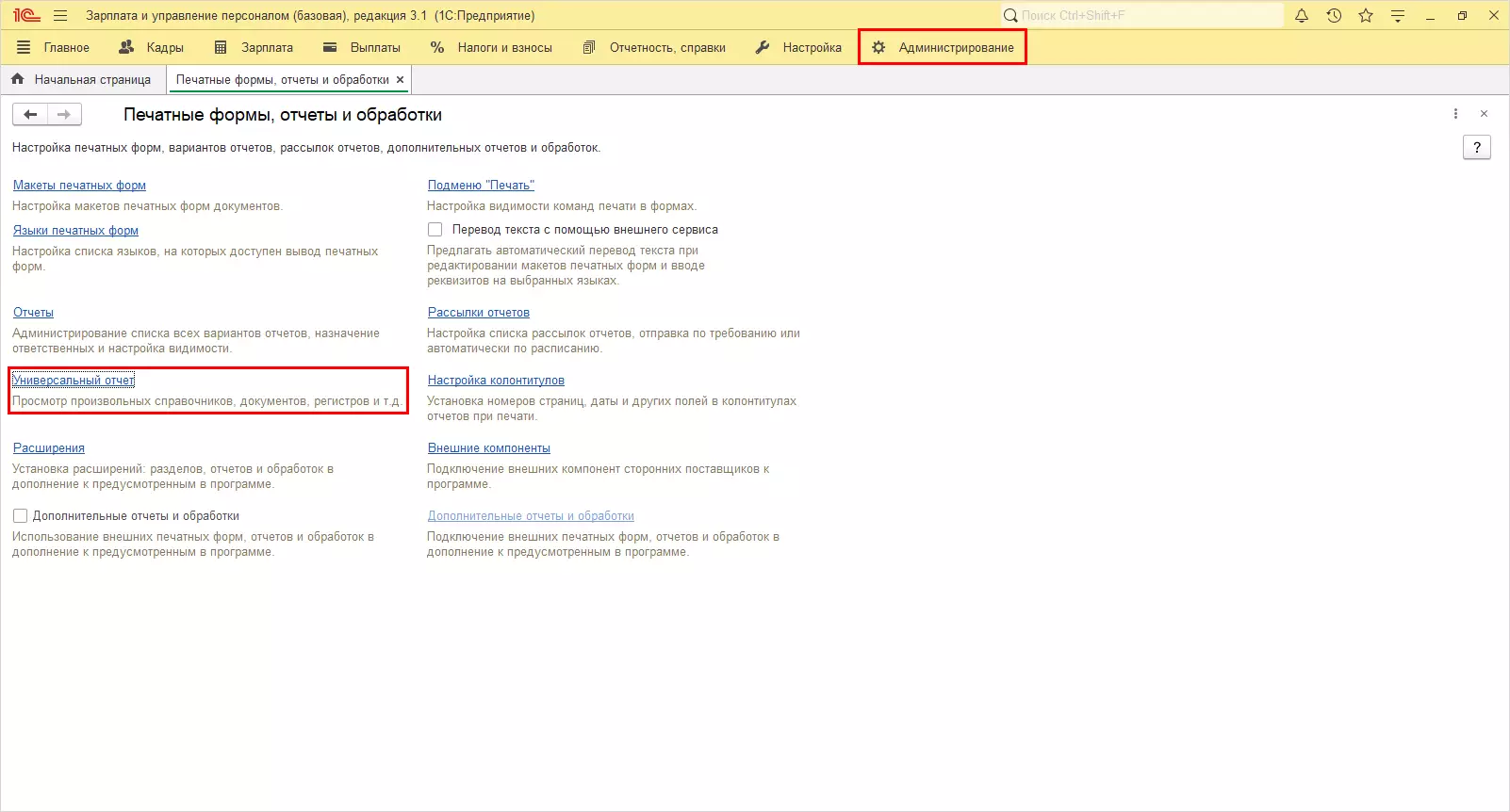 Также во всех конфигурациях 1С:Предприятие 8.3 «Универсальный отчет» можно найти в разделе Печатные формы, отчеты и обработки. В 1С:Бухгалтерия, 1С:Бухгалтерия государственного учреждения, 1С:Зарплата и управление персоналом, и некоторых других конфигурациях он находится в разделе Администрирование.