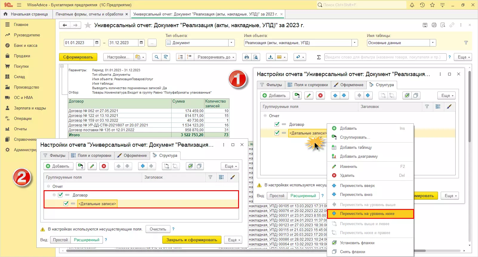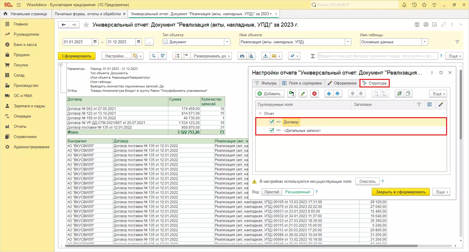 Шаг 7. Перейдите еще раз по пути Настройки – вкладка Структура. Зададим группировку по полю «Контрагент» и под ней дополнительно структуру данных – по договору.