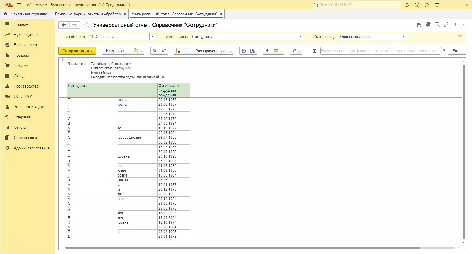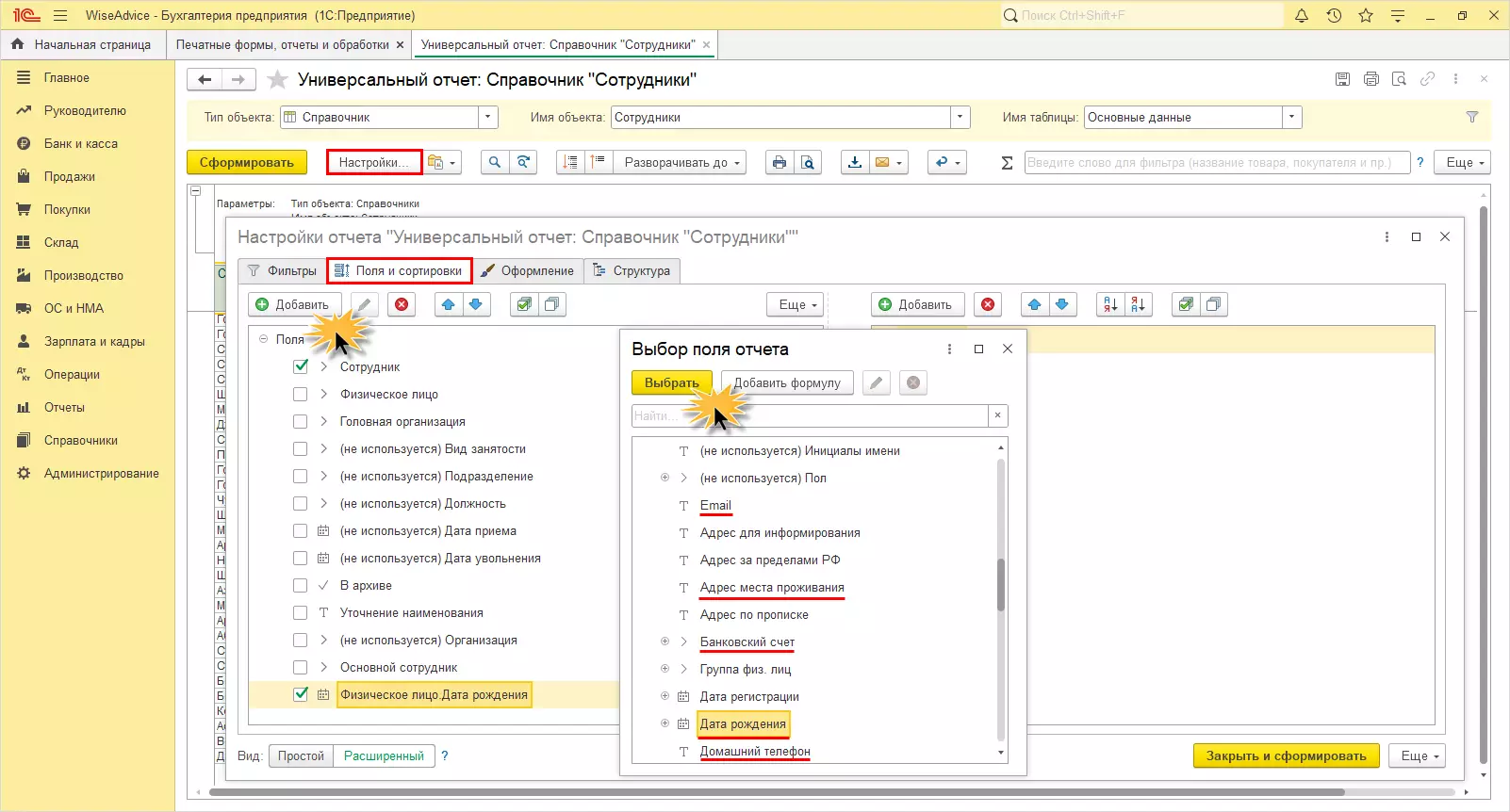Шаг 1. Выберите справочник Сотрудники – имя таблицы – Основные данные. Нажмите «Сформировать» и просмотрите полученные данные. Для изменения и настройки представления информации в отчете нажмите кнопку «Настройки» и перейдите на вкладку Поля и сортировки. В таблице слева представлены поля, отображающиеся в сформированном отчете. Убрав галочки, пользователь отключает ненужные столбцы отчета.