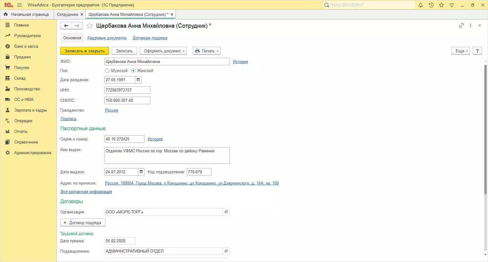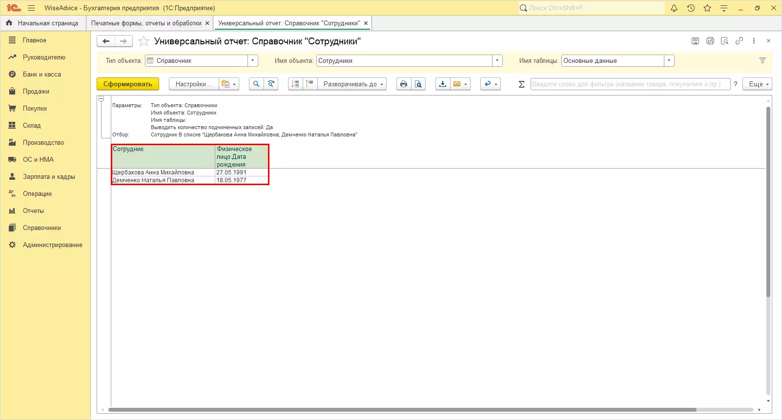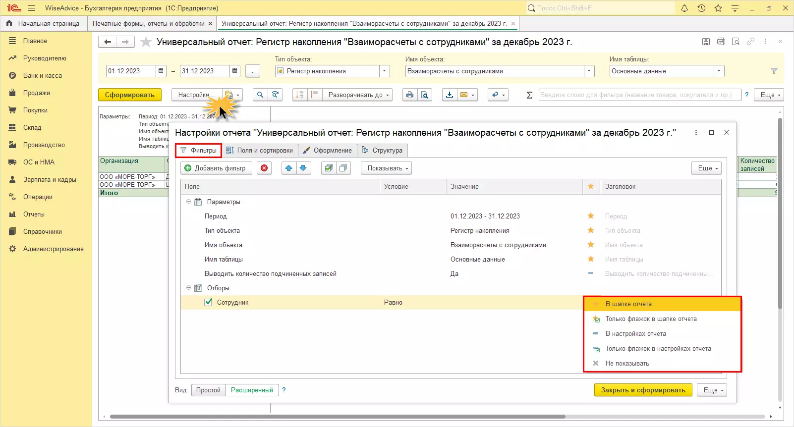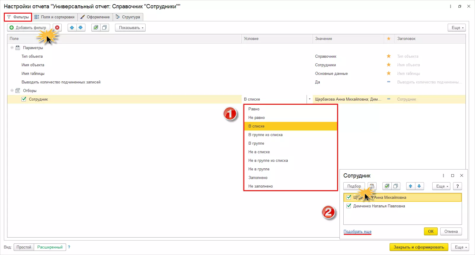 Шаг 2. Добавьте поле отбора «Сотрудник», задав вариант условия – у нас, «В списке». В открывшемся окне подберите сотрудников из справочника. Нажмите «Закрыть и сформировать».