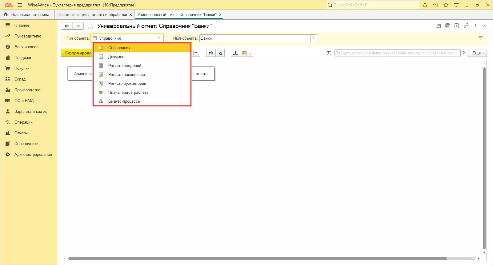 Например, пользователю необходимо выбрать определенную информацию по сотрудникам – день рождения, адрес, телефон и т.п. Выбрав «Тип объекта» – «Справочник» можно сделать выборку информации по элементам любого справочника.