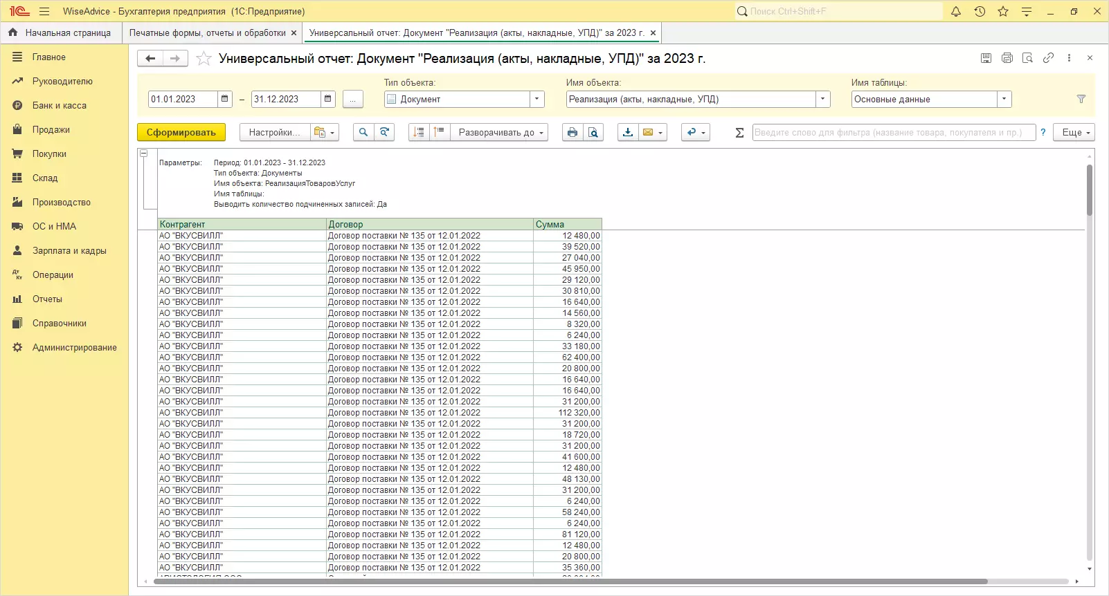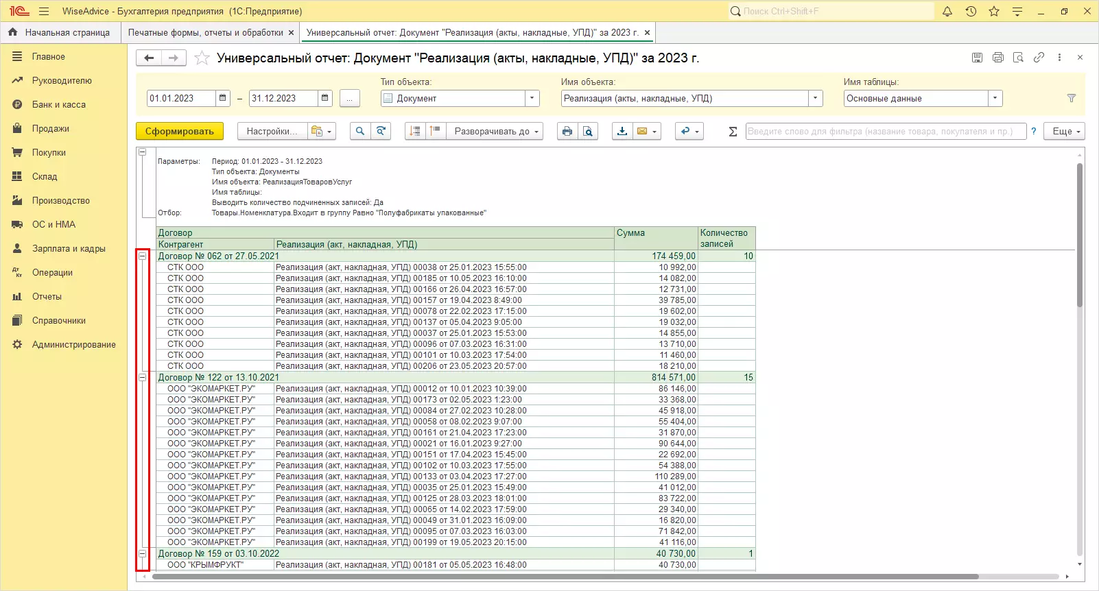 Используя значки группировки «-/+» пользователь может сворачивать и разворачивать данные по итогам. В нашем примере данные сгруппировались по полю «Договор» с детализацией по документам «Реализация (акт, накладная, УПД)».