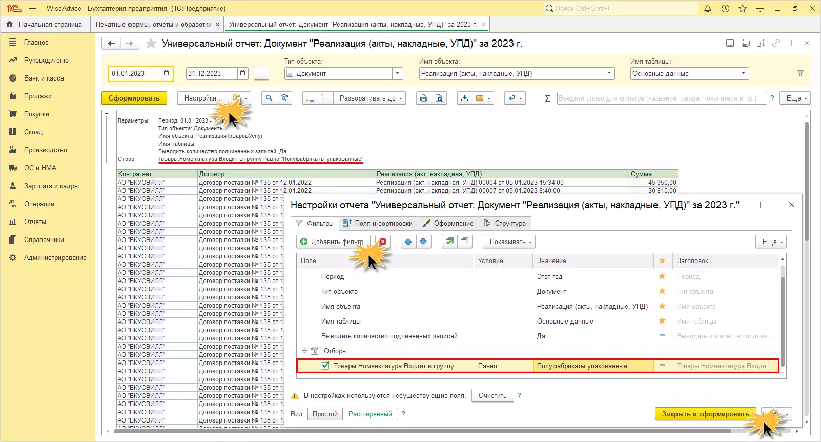 Шаг 6. Перейдите по кнопке «Настройки» и добавьте отбор на вкладке Фильтры - номенклатура входит в группу и выбрать любую интересующую папку – например, «Полуфабрикаты упакованные». Нажмите кнопку «Закрыть и сформировать».
