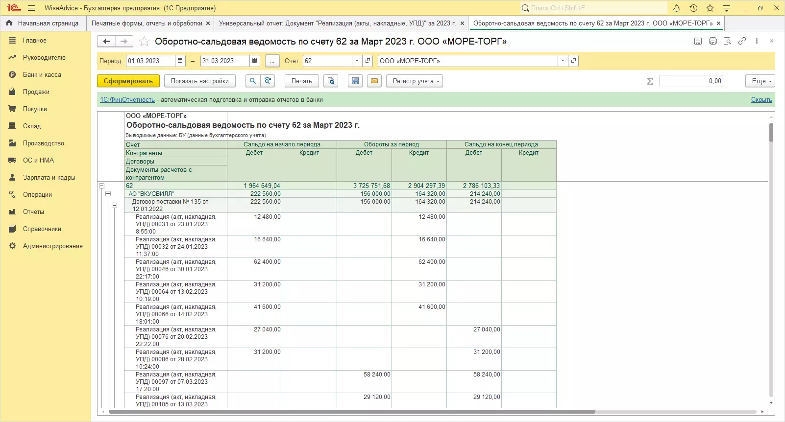 При такой настройке все данные отразятся с группировкой по договорам, отражая итоговую сумму по группируемой строке и детализацию по записям – документам.