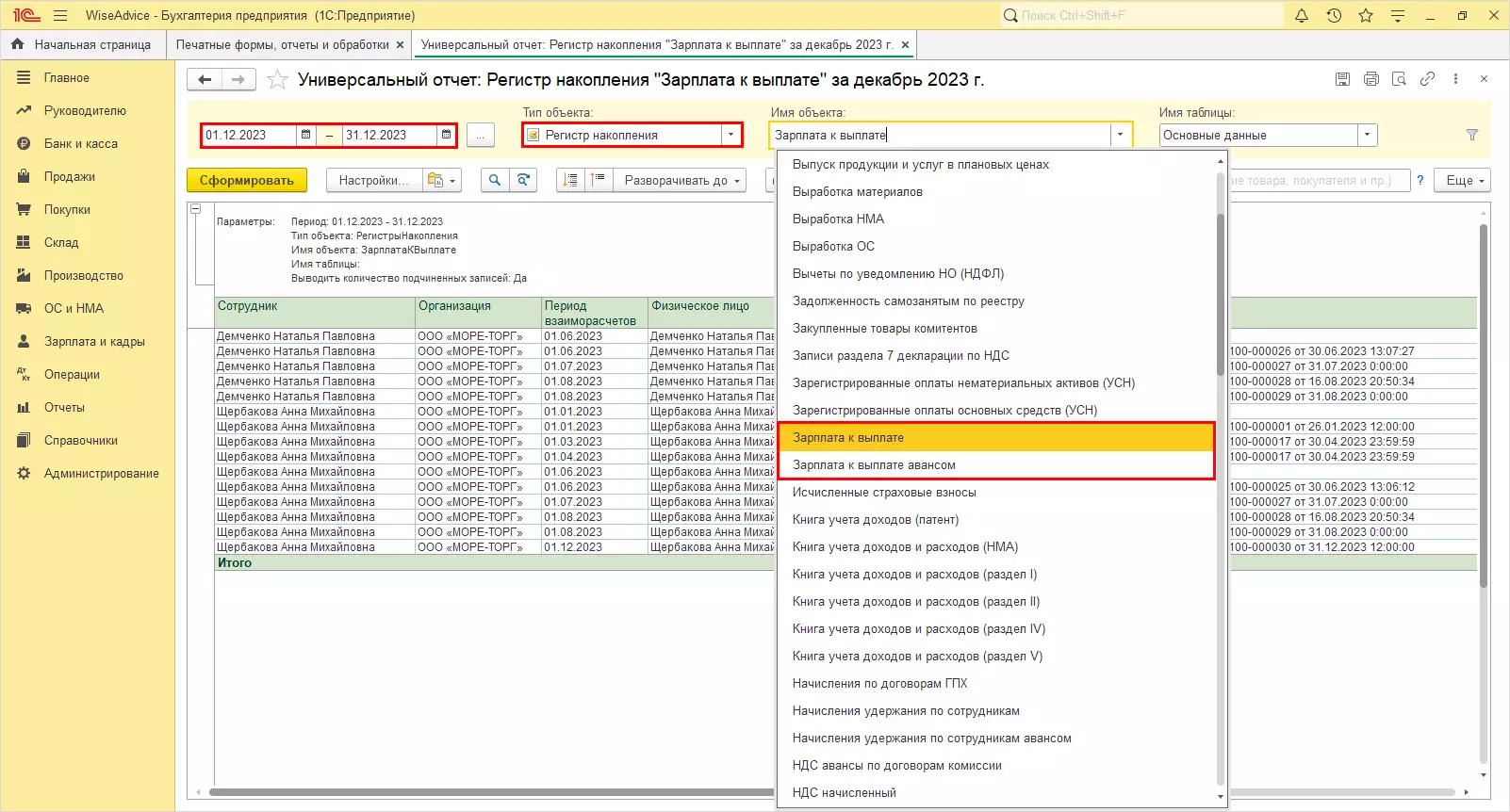 После формирования отчета данные анализируются, и при необходимости можно установить отбор по сотруднику и другим необходимым параметрам.