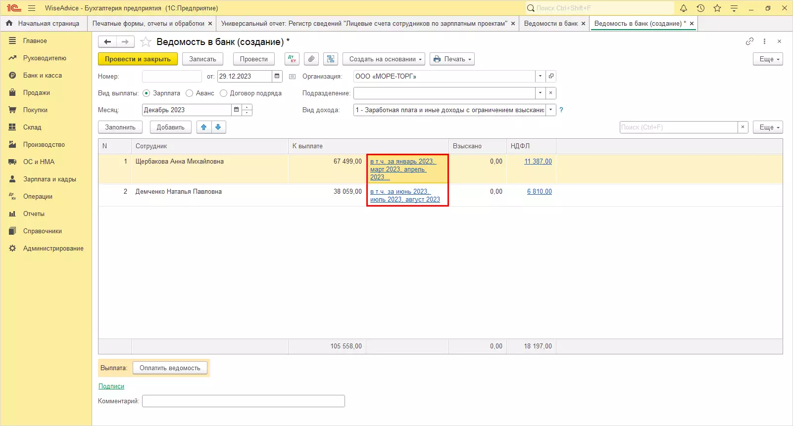 Рассмотрим пример, который часто встречается на практике. При формировании ведомости на выплату зарплаты за месяц справочно показывает «в т.ч. другие месяца». Это говорит о том, что в каких-то месяцах некорректно заполнили документ, или данные изменялись в документе вручную. В результате может образоваться «перекос» в регистрах.