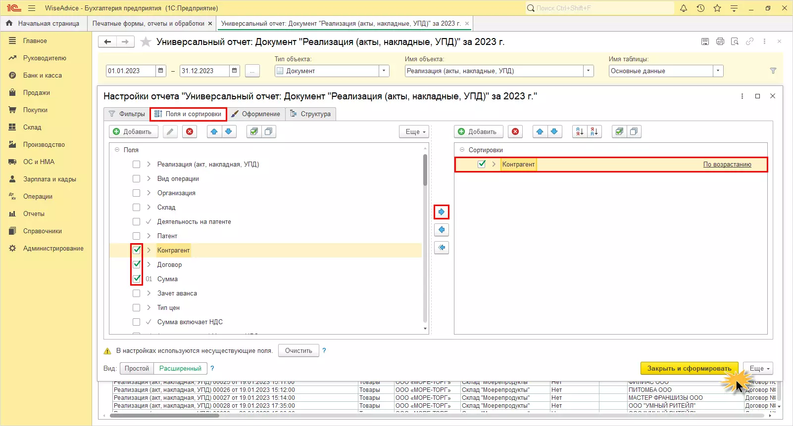 С помощью голубой стрелки «Вправо» задайте порядок сортировки, перенеся в окно элемент, по которому необходимо упорядочить информацию – здесь, по полю «Контрагент» в порядке возрастания. Нажмите «Закрыть и сформировать».