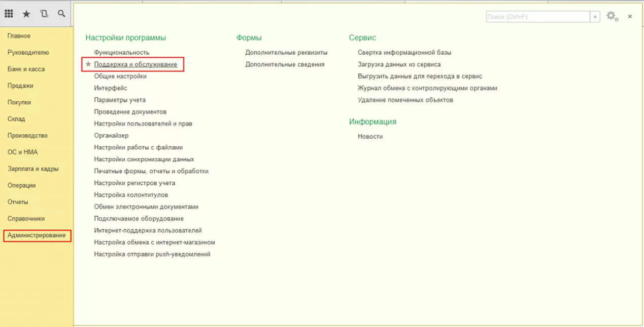 Для смены настроек перейдем в раздел «Поддержка и обслуживание» пункта меню «Администрирование».