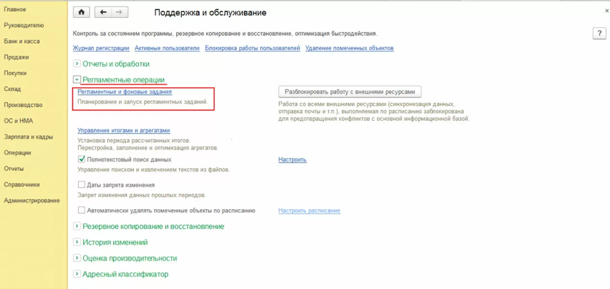 После, в появившемся окне в блоке «Регламентные операции» нажимаем «Регламентные и фоновые задания».