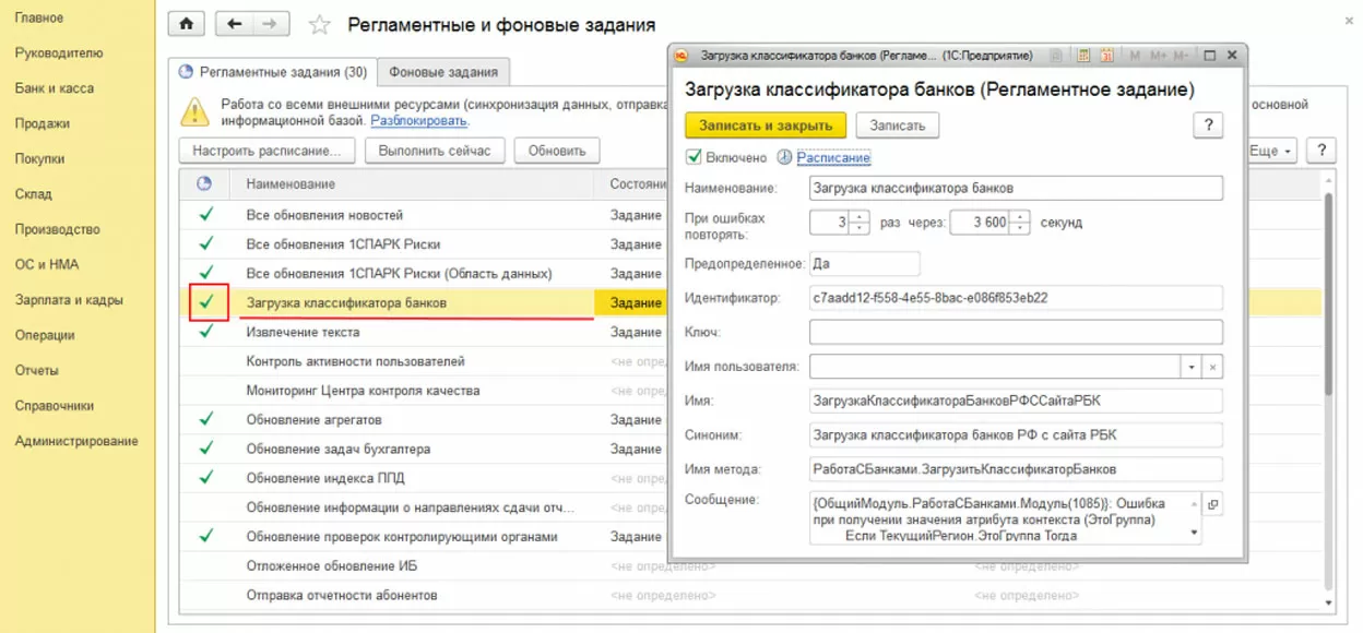 В открывшемся перед нами окне в перечне всех регламентных и фоновых заданий найдем необходимое нам задание – «Загрузка классификатора банков». В случае, когда зеленая галочка отсутствует, автоматическое обновление классификатора отключено. Для открытия настроек необходимо дважды кликнуть левой кнопкой мыши по нужному регламентному заданию. Фирмой 1С необходимые настройки уже были заданы, можно просто посмотреть их, в случае же необходимости, установить собственные параметры.