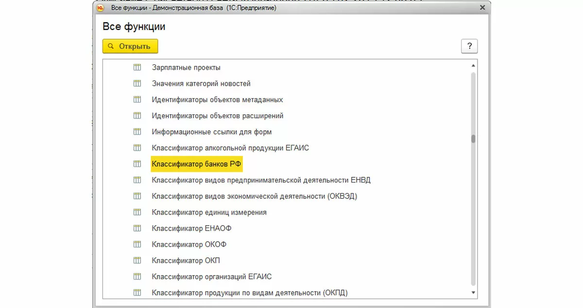 Можно напрямую открыть «Классификатор банков РФ» через закладку «Все функции».