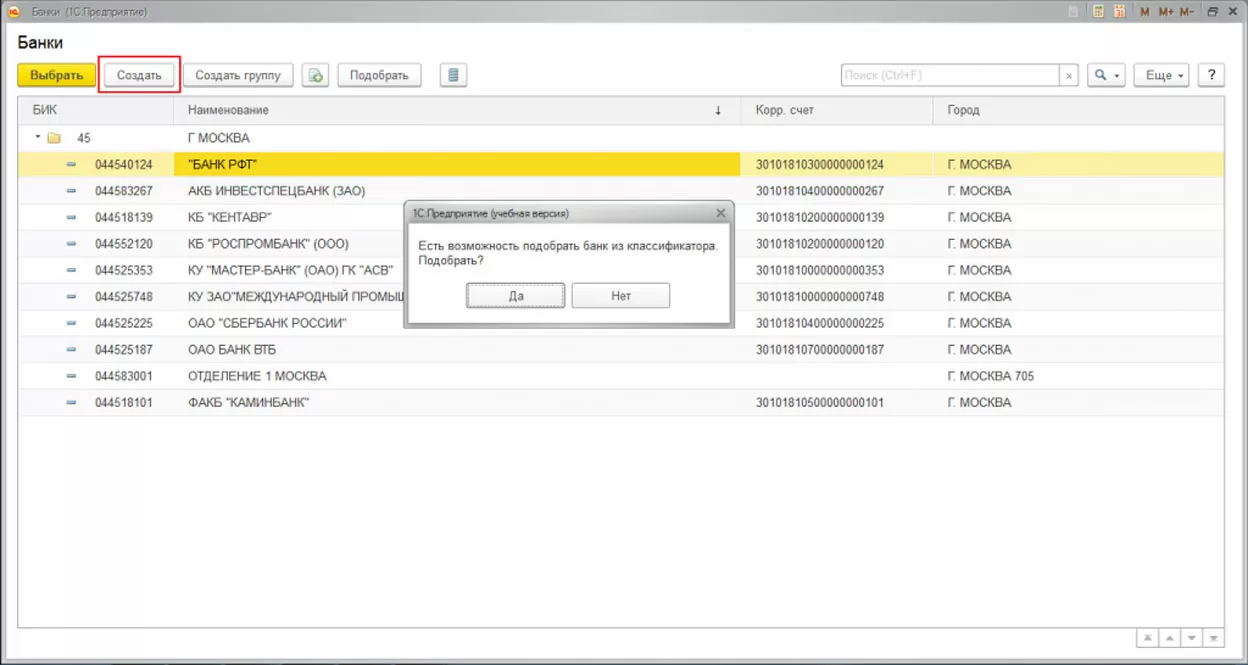 Классификатор можно запустить из справочника «Банки», который находится в меню «Справочники». В случае, когда он в этом меню отсутствует (например, когда программа была впервые установлена), это можно исправить в настройках навигации, путем переноса его из одной части в другую. Находясь в справочнике «Банки», выбираем действие «Создать», после чего будет предложен выбор банка из классификатора. После согласия, откроется искомый справочник.