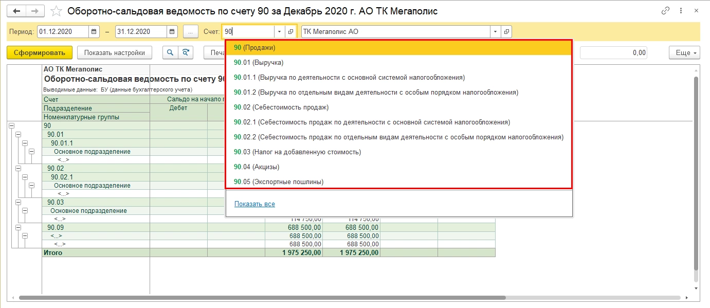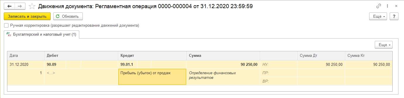 Документом «Закрытие счетов 90, 91» отражена сумма прибыли (убытка) от продаж на счете 99.01.1.
